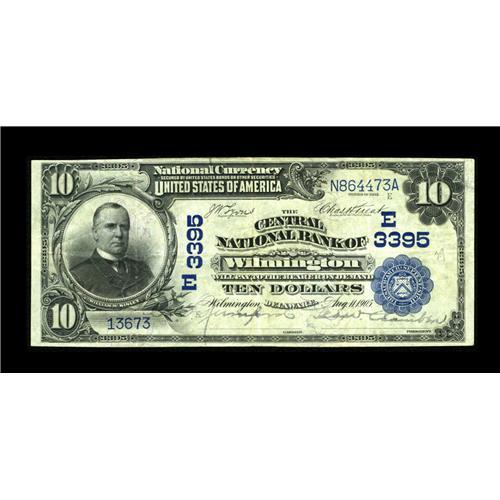 <B>Wilmington, DE</B></I> - $10 1902 Date Back Fr. 617 <B>The Central NB</B></I> Ch. # (E)3395<BR>While the census now includes 36 large notes from here, this is the only $10 Date Back verified to date. It is a well margined and quite crisp <B>Very Fine-Extremely Fine</B></I> displaying almost pack fresh crispness. Lyn Knight last sold this note in November of 2001 for $935. Given its scarcity within the issuing bank and the always strong demand for Delaware material, as well as its superior eye appeal, we anticipate a realization of no less than...<BR><BR><b>Shipping:</b> Coin/Currency (<a target="_blank" href="http://www.heritageauctions.com/common/shipping.php">view shipping information</a>)