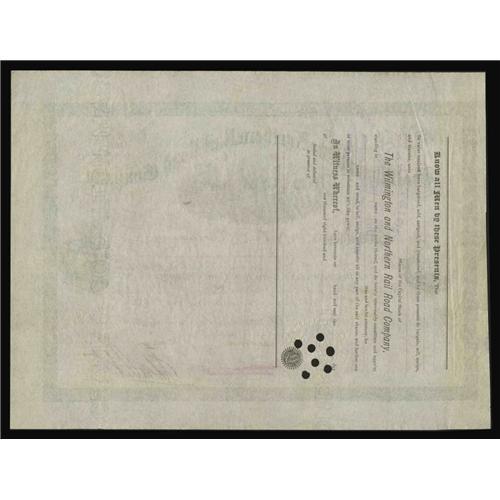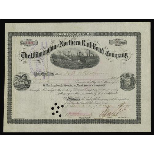 <B>Wilmington and Northern Rail Road Company. 19 Shares</B></I><BR>Henry Algernon du Pont (1838-1926), Army Officer, U.S. Senator, Industrialist and partner in E. I. du Pont de Nemours & Co. He graduated from West Point at the head of his class in 1861. In command of artillery, he served most commendably in many battles. He received the rank of lieutenant-colonel in 1864 and received the Congressional Medal of Honor for distinguished services and gallantry at Cedar Creek. Later became a member of E. I. du Pont, and he became President of the Wilmington and Northern Railroad. He signs this great 1890's stock as President. Slight signs of faded red manuscript cancellation and hole cancelled, along with small tear at left edge. <B>Very Fine+.</B></I>