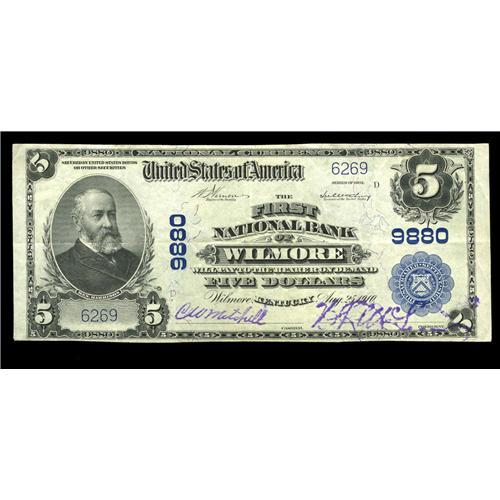 <B>Wilmore, KY</B></I> - $5 1902 Plain Back Fr. 601 <B>The First NB</B></I> Ch. # 9880<BR>This comes from a very rare bank which was the sole issuer in this tiny Jessamine County community. It's a hair nicer than the Gale collection example offered above, and should realize about the same amount if not a touch more. <B>Very Fine+,</B></I> with vivid purple signatures.