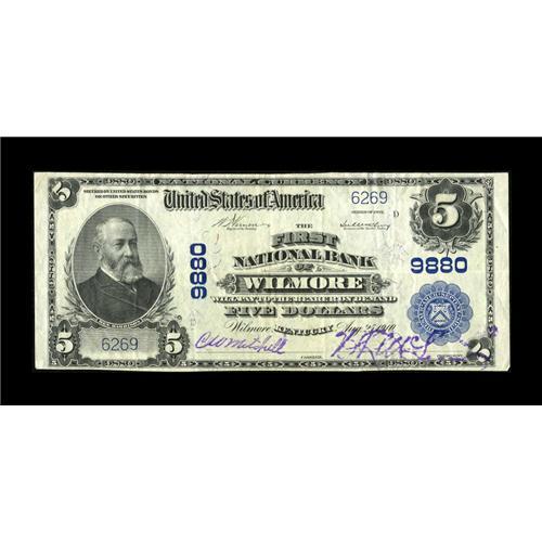<B>Wilmore, KY</B></I> - $5 1902 Plain Back Fr. 601 <B>The First NB</B></I> Ch. # 9880<BR>This comes from a very rare bank which was the sole issuer in this tiny Jessamine County community. Just five notes make up the entire census in large size from here, with this the nicest of the group. <B>Very Fine+,</B></I> with vivid purple signatures.<BR><BR><b>Shipping:</b> Coins & Currency (<a target="_blank" href="http://www.heritageauctions.com/common/shipping.php">view shipping information</a>)