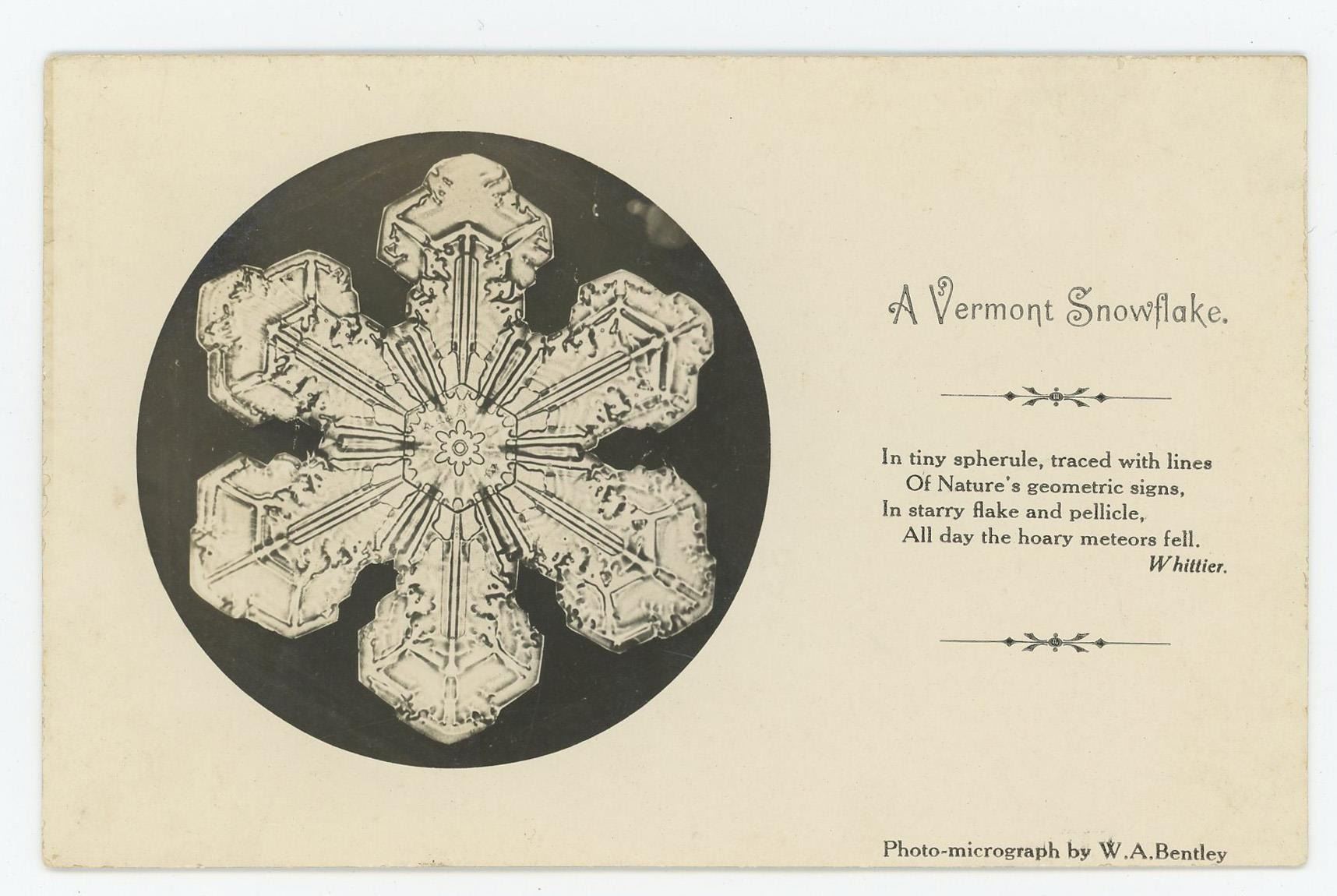 Published by Eagle Camp out of South Hero, Vermont. Includes a quote by John G. Whittier. The photo micrograph of the snowflake was captured by WA Bentley. Wilson A. "Snowflake" Bentley (1865–1931) was an American farmer and pioneering photographer from Jericho, Vermont, best known for being the first person to successfully photograph individual snowflakes. Beginning in the 1880s, he used a microscope attached to a camera to capture over 5,000 snow crystal images, demonstrating that no two snowflakes are alike. His work advanced meteorology and crystallography and was later published in Snow Crystals (1931), co-authored with William J. Humphreys.