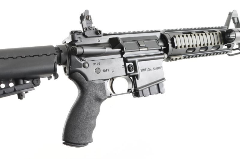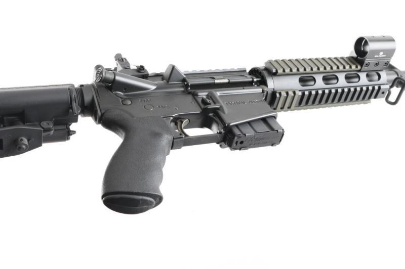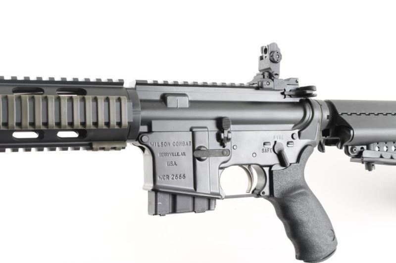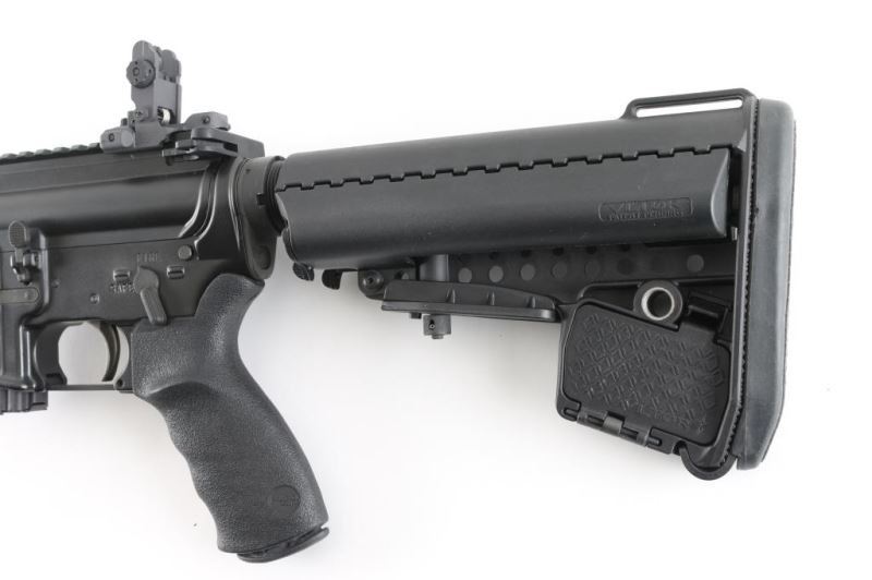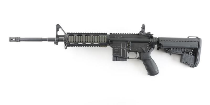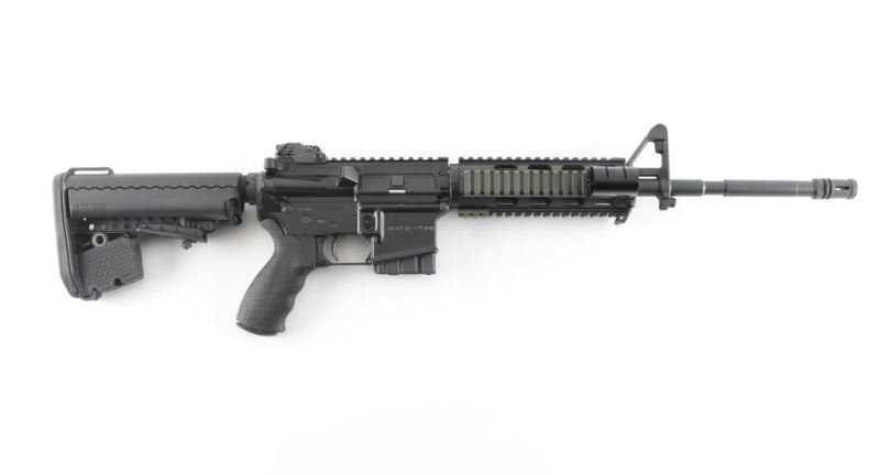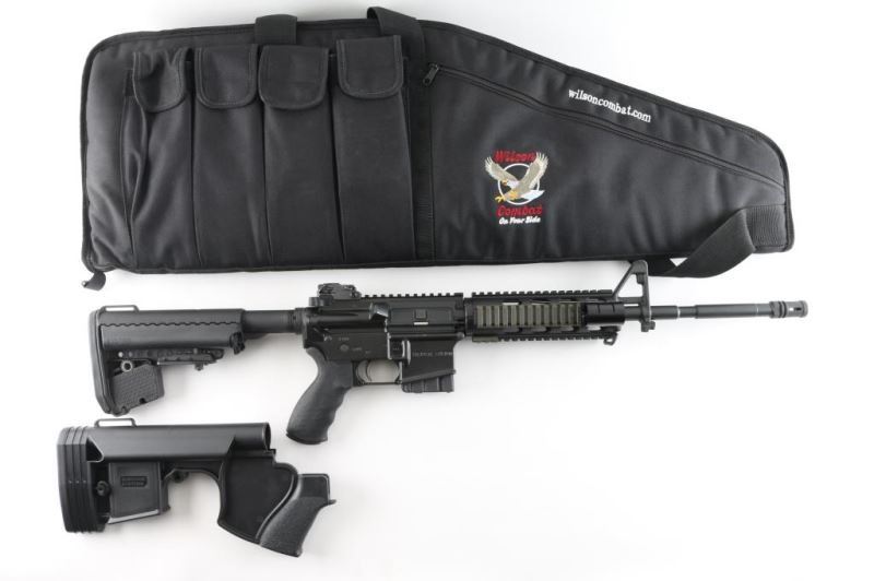 SN: WCR2666 Gas operated semi-automatic AR15 platform modern sporting rifle chambered in 5.56x45mm NATO. Features a matte black finish, 16.25" 1/9 twist M4 profile barrel, bird cage flash hider, carbine length gas system, A2 front sight/gas block with bayonet lug, flat-top upper receiver with forward assist, shell defector & dust cover, ARMS pop-up rear peep sight, push button magazine release, manual safety, aftermarket ergonomic pistol grip with storage compartment, VLTOR collapsible shoulder stock with storage compartments, quad rail hand guards, OLIGHT flashlight holder attached to handguard, forward sling swivel, sling slot and QD swivel socket on butt. Safety rotates freely - appears to be missing detent and/or spring. Bore is very good. Retains 98% finish with handling marks. Stocks are excellent. Includes (1) magazine (short, approx 10 round capacity), Wilson Combat soft side nylon case (with mag pouches), spare fixed (non collapsing) stock with storage well for spare mag. Condition is NRA Excellent (needs small parts replaced) *** Modern Firearm ***