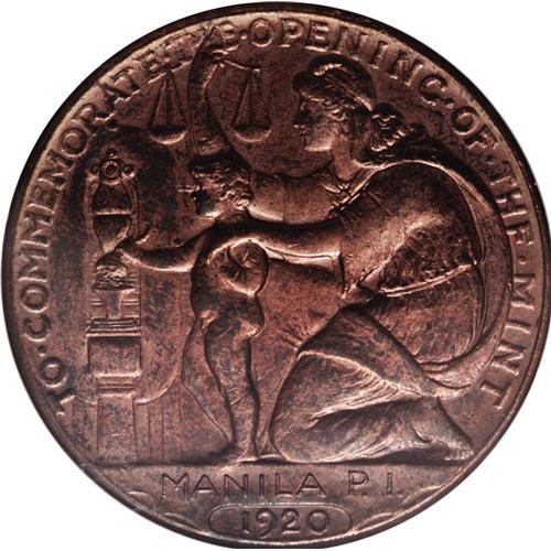 <B>Wilson Dollar in bronze 1920,</B></I> HK-450, MS63 RB NGC, especially clean surfaces that are more red than brown. Very scarce. The story is that many of these were dumped into Manila Bay. Even those that were spared, considering the humidity of the Philippines, cannot look like this beauty.<BR><BR><b>Shipping:</b> Coin/Currency (<a target="_blank" href="http://www.heritageauctions.com/common/shipping.php">view shipping information</a>)