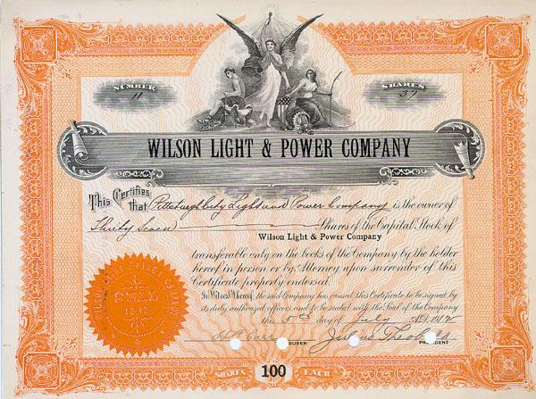 1912, Pennsylvania. Stock certificate for 37 shares. Orange/Black with orange seal. Vignette of allegorical figures at top center. Litho. Very fine.