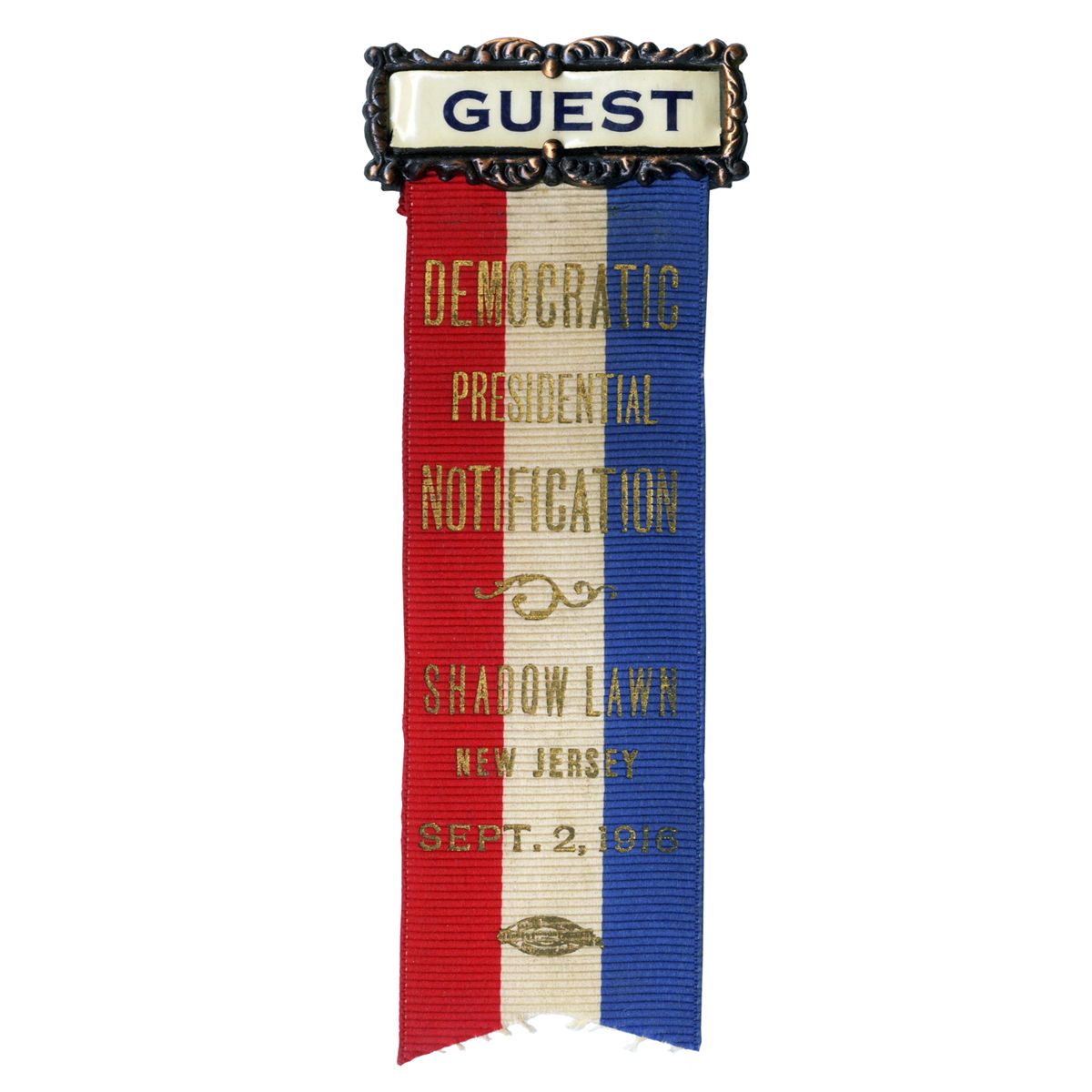 1916 ''Democratic Presidential notification'' pin, provided to guests attending the ceremony that would nominate President Woodrow Wilson to campaign for a second term in office. The red, white and blue ribbon is embossed in gold: ''DEMOCRATIC PRESIDENTIAL NOTIFICATION'' with the date and place of the ceremony: Shadow Lawn, New Jersey, 2 September 1916. A brooch with the framed word, ''GUEST'' holds the ribbon. Wilson would go on to win the 1916 election and serve a second Presidential term. The ribbon is in near fine condition.
