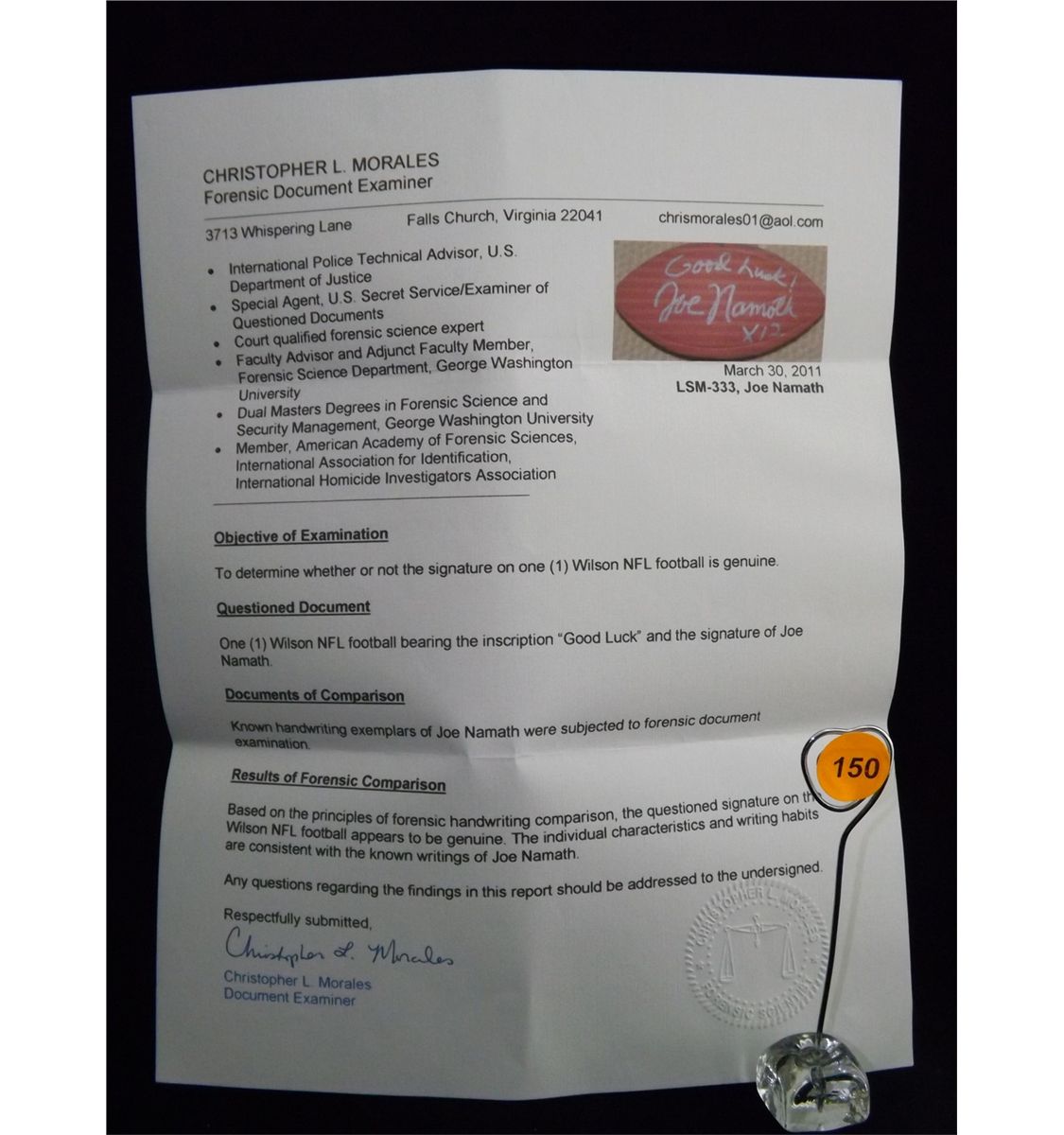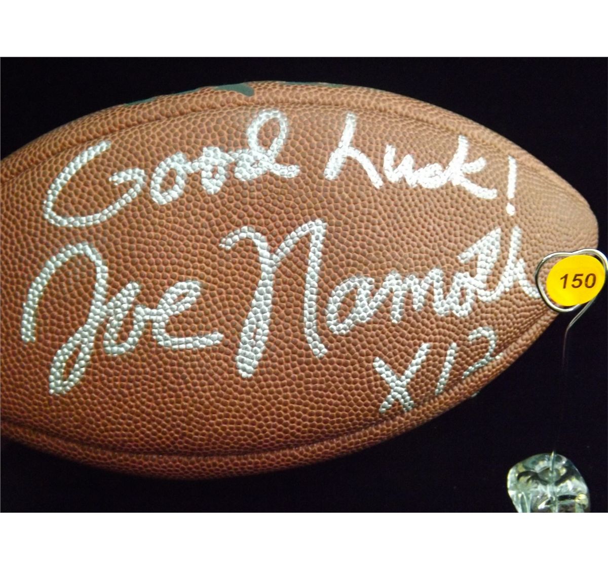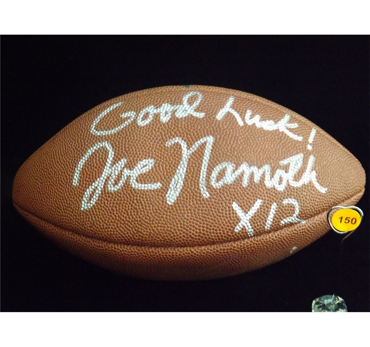 Wilson Pro Tack NFL Football Bearing the Inscription "Good Luck!" and Autographed by Joe Namath. Appraised or estimated retail value $1000. COA by Christopher Morales. All Sales Final. Please see terms and conditions of auction.
