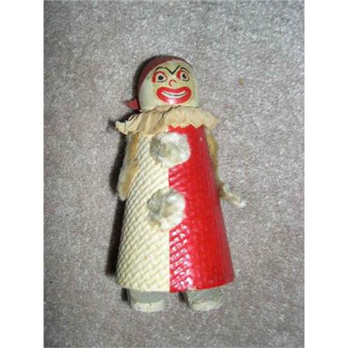 <table width="100%" border="0" cellspacing="0" cellpadding="4"><tr><td><em> Ramp Walker Clown - Wilson Walkie </em></td></tr><tr> <td width="100%"> This is a toy from the 1930's. It is called a Wilson Walkie. It is made from a piece of wood and old thread cone. The legs swing inside the cone from the wood head and are such that when the toy is put on an incline or ramp, it will walk. It is stamped on the bottom Made in U.S.A. This clown has a decal face and crepe paper ruffle around his neck. There is a pipe cleaner for his arms and buttons.There is part of the red crepe paper hat remains only around the front of the face. The hat has basically been torn off. It would be easy enough to replace with old red crepe paper. Many different figures were made as Wilson Walkies. Buyer to pay $8 for shipping, insurance, and handling. Thanks for viewing. </td></tr><tr> <td> </td></tr><tr> <td>Reference #: TO1</td></tr><tr><td>Condition:very good</td></tr><tr><td>Year:circa 1930</td></tr><tr><td>Country:U.S.A.</td></tr><tr><td>Maker:Wilson Walkie</td></tr><tr><td>Height:4.5</td></tr><tr><td>Title:Wilson Ramp Walker Clown</td></tr><tr><td>Style:ramp walker</td></tr><tr><td>Materials:wood</td></tr><tr><td>Type:toy</td></tr><tr><td>Location:Neapolis, OH</td></tr></table>