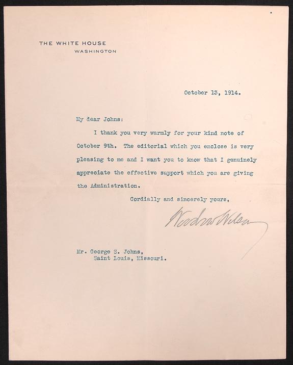 Wilson, Woodrow. Typed letter signed as President, on The White House letterhead, 1 page with integral blank leaf, 8¾ x 7", Washington, October 13, 1914. To Mr. George S. Johns in Saint Louis, Missouri. In part: "…the editorial which you enclose is very pleasing to me and I want you to know that I genuinely appreciate the effective support which you are giving the Administration." Light toning, else fine. Accompanied by an engraving of Wilson.