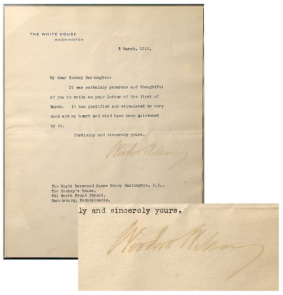 Wilson, Woodrow. Typed letter signed as President on The White House / Washington letterhead, 1p, 9 x 7", Mar. 6, 1919. To (Episcopal) Bishop James Henry Darlington in Harrisburg, Pennsylvania, thanking him for a letter. "It has gratified and stimulated me very much and my heart and mind have been quickened by it…." Fine; the signature is somewhat light but quite legible. Matted with an image of Wilson and framed to an overall size of 17¼ x 23 in. Bishop Darlington served on several war-related committees; he received the Legion of Honor from France and Greece, and Serbia also awarded him decorations for his work.