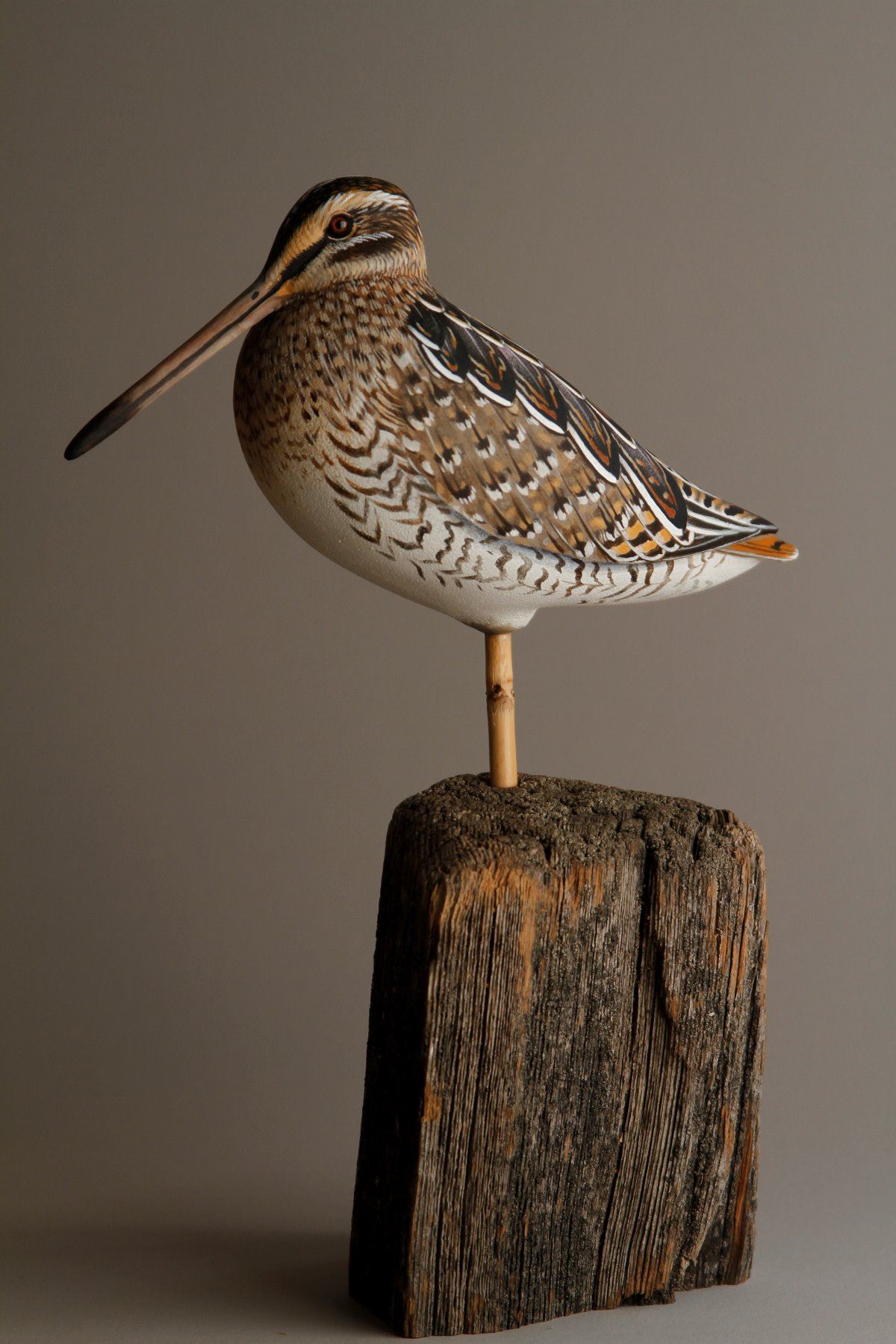 Artist: Andy White. Title: Wilson's Snipe. Artwork size: 12" x 4" x 8". Frame: N/A. Medium: Acrylic on hand-carved tupelo. Artist's description: A decoy carver for over 15 years, this is my first time carving the handsome and illusive snipe. Yes, snipe DO exist and yes, they even sit on fence posts. This bird was incredibly fun to paint and it is carved "decoy style" where the legs aren't carved but are represented by a dowel meant to be shoved into the ground wherever the hunter deploys the decoy spread. In this case I used bamboo for the legs since the bamboo naturally had the right coloration and the "joint" resembles the knee joint on the real bird. I'm very pleased with the result of this carving even though it's a departure from what I normally do.