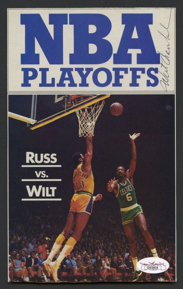 Vintage program cover measures 5x8.5" in size and features Wilt Chamberlain vs. Bill Russell. Hand-signed in black ink by Wilt Chamberlain (Lakers HOF D 1999). Autograph includes an official James Spence Authentication (JSA) hologram and matching COA for authenticity purposes.
