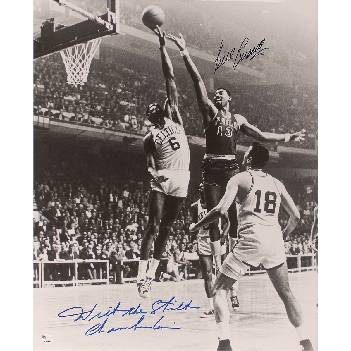 Glossy 16 x 20 photo of Russell attempting to block a lay-up by Chamberlain at the old Boston Garden, signed in blue felt tip “Wilt the Stilt Chamberlain” and in black felt tip “Bill Russell.” In fine condition, with an authentication label affixed to lower left.