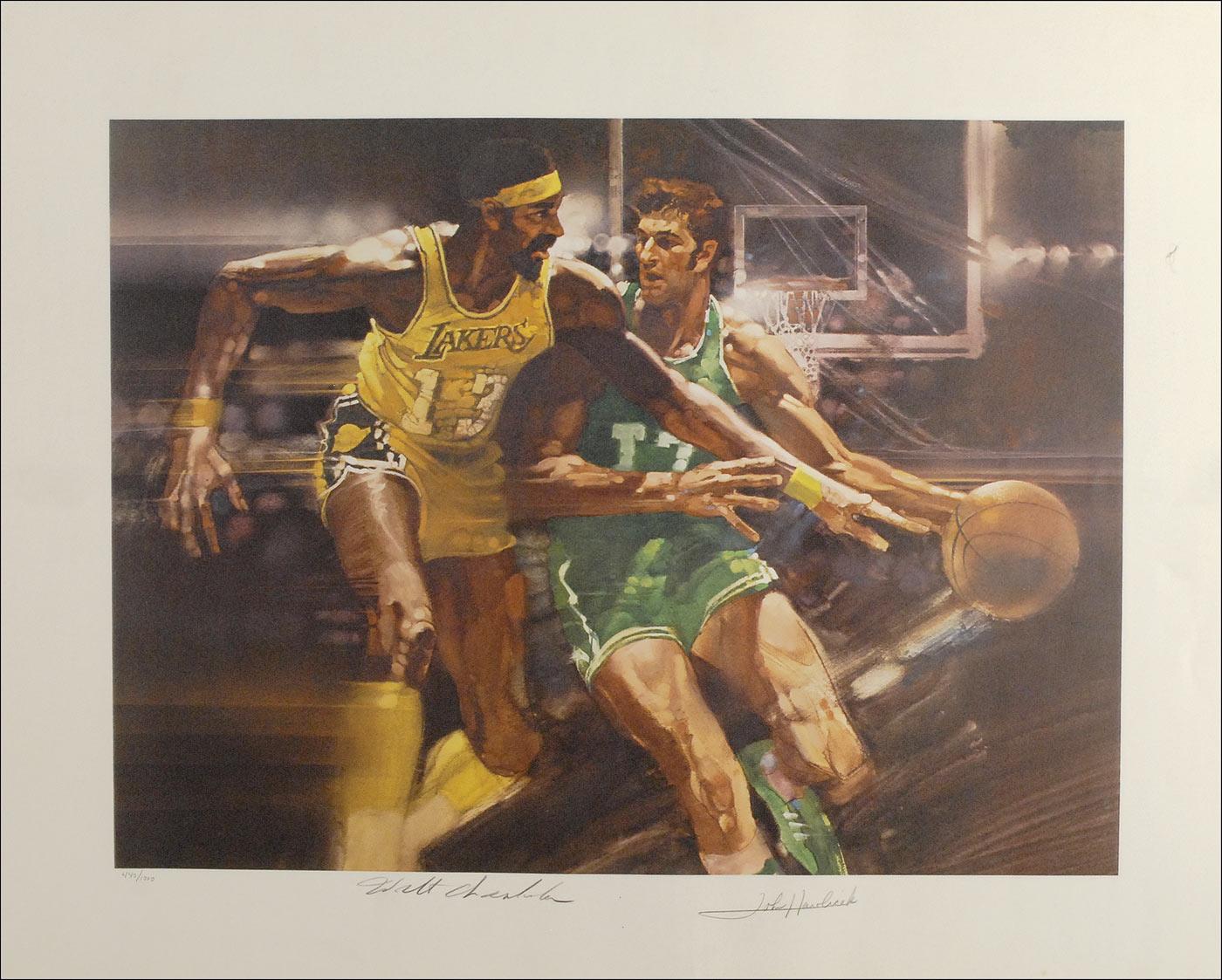 Difficult to find color limited edition 25 x 20 ‘Living Legend’ series print, numbered 470/1000, issued in the 1970s by Sports Illustrated, with a strongly stylized depiction of the pair going at it on the hardwood, signed in the lower border in pencil by Wilt Chamberlain and John Havlicek. In fine condition with a few light border creases and a couple spots of trivial soiling.