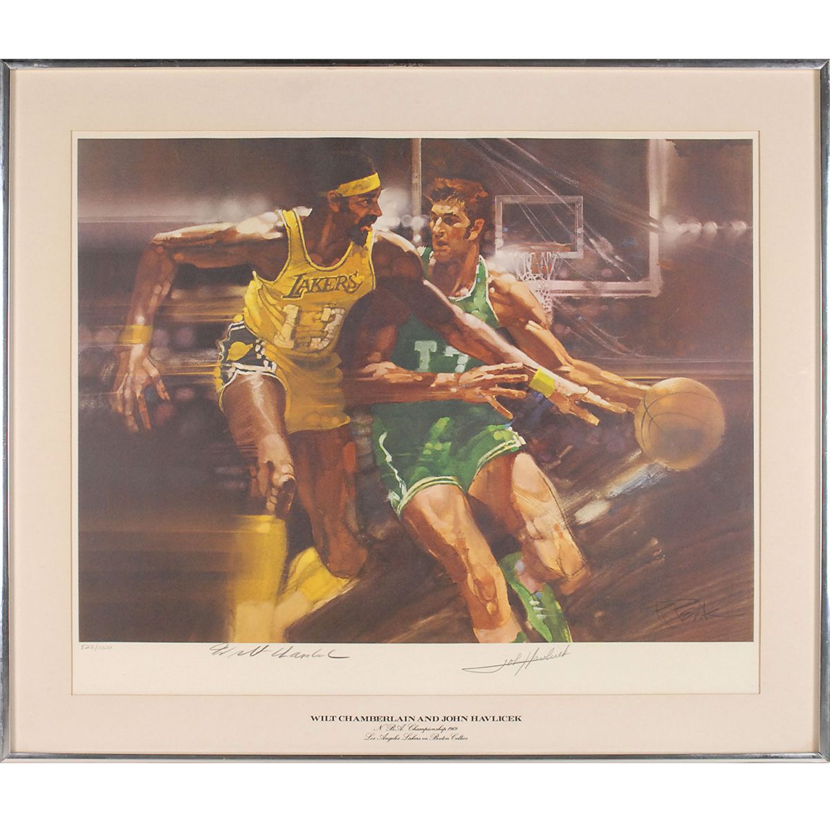 Difficult-to-find color limited edition 20.25 x 16.5 ‘Living Legend’ series print, numbered 526/1000, issued in the 1970s by Sports Illustrated, with a strongly stylized depiction of the pair going at it on the hardwood, signed in the lower border in pencil by Wilt Chamberlain and John Havlicek. Double-matted and framed to an overall size of 24.75 x 21. In fine condition. Oversized.