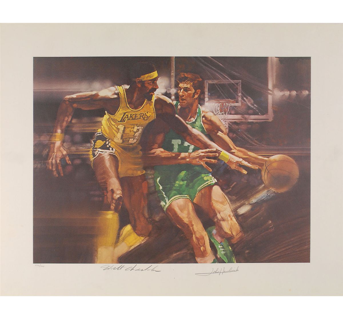 Color limited edition 25 x 20 print of a strongly stylized depiction of Chamberlain and Havlicek competing on the hardwood, numbered 440/1000, signed in the lower border in pencil by both. In fine condition, with light creasing and soiling to borders. These difficult-to-find prints were issued in the 1970s by Sports Illustrated as part of the ‘Living Legend’ series.