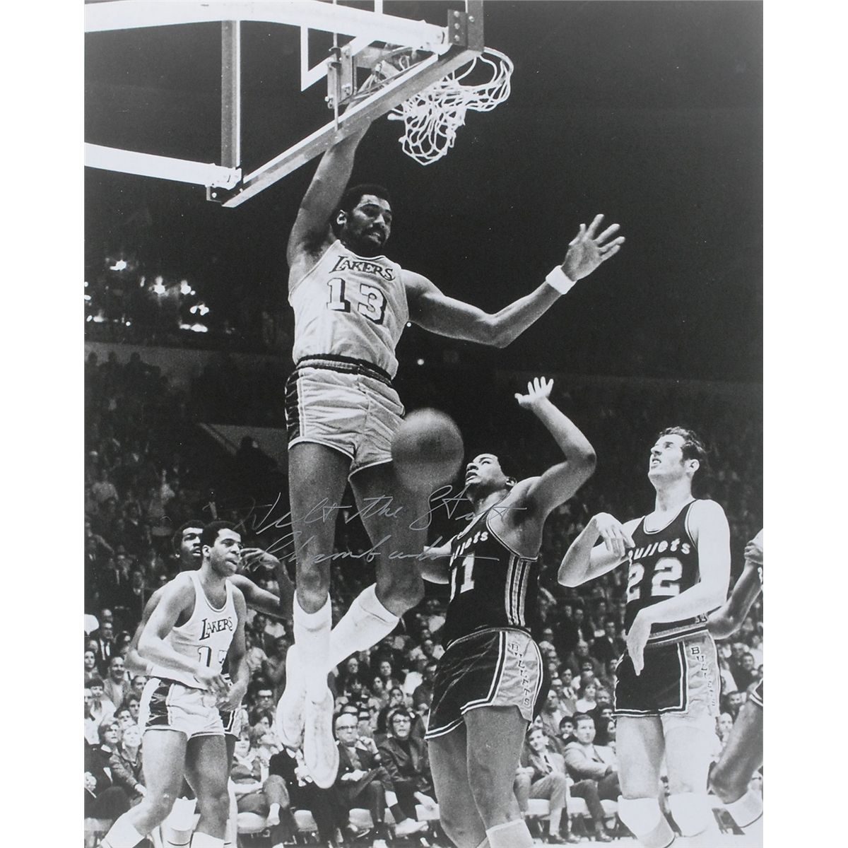 Glossy 16 x 20 photo of Chamberlain still at the rim after dunking, signed in silver ink, “Wilt the Stilt Chamberlain.” In fine condition.