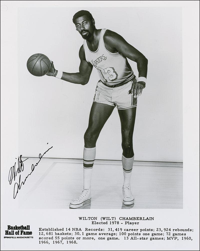 Glossy 8 x 10 Basketball Hall of Fame photo of Chamberlain in his Lakers uniform, signed in black felt tip. In fine condition.