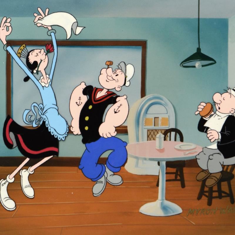 "Wimpy's Cafe" is a limited edition hand inked and hand painted animation cel with background, numbered and hand signed by Myron Waldman (1908-2006). Includes Certificate of Authenticity! Measures approx. 14" x 12" (background with cel).
