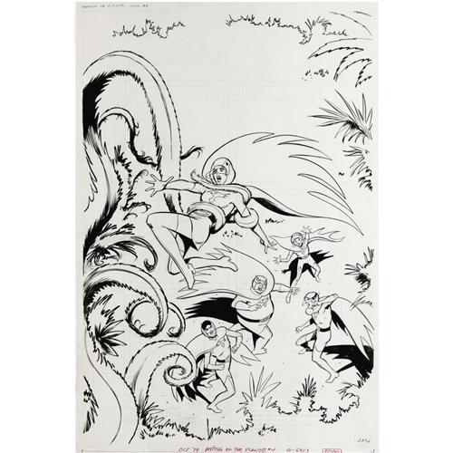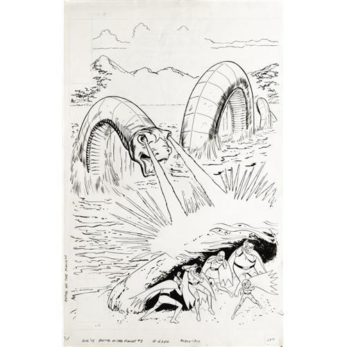 <B>Win Mortimer - Battle of the Planets Cover Original Art, Group of 3 (Whitman, 1979).</B></I> The G-Force battle three gigantic monsters on the covers of issues #3, 4, and 5. The covers' image areas measure approximately 13.75" x 20". The covers have blue pencil indications on where to position the title logos, but the logo stats are not attached to the art; otherwise, the covers are in Excellent condition.<BR><BR><b>Shipping:</b> Large Flat (<a target="_blank" href="http://www.heritageauctions.com/common/shipping.php">view shipping information</a>)