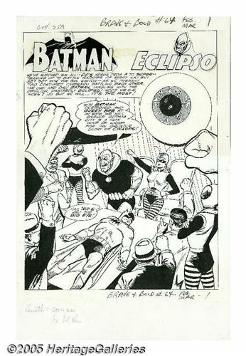 <B>Win Mortimer - The Brave and the Bold #64 Splash Page 1 Original Art (DC, 1966).</B></I> All hail Eclipso -- the Devilish Dark-sider has laid Batman out on a table like a cold mackerel for the Queen Bee and her drones to taunt in <B>The Brave and the Bold</B></I> thriller, "Batman Versus Eclipso." Bob Haney's captions show the influence of the campy bat-craze sparked by the '60s hit TV show -- they're the most! Adding the finishing touch to this surreal crime wave scene is the huge gleaming eye-ball in the background of Win Mortimer's <I>mise-en-scene</B></I>. The image area of this splash page measures 12" x 16". Aside from the missing "Versus"stat in the title, the art is in Excellent condition.