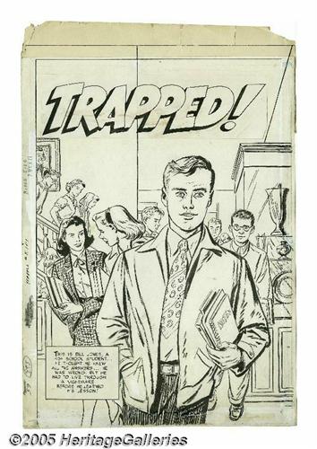 <B>Win Mortimer (attributed) - Trapped! #nn Cover Original Art (Harvey, 1951).</B></I> One of the most notorious anti-drug "educational" comics ever produced is the now-hilarious <B>Trapped!</B></I>, in which a bright high school student becomes a hopeless junkie after only a few puffs off a marijuana "reefer." It's a camp classic, the comic book equivalent to the "Reefer Madness" movie of the 1930s. This cover art also serves as the splash page to the story, with trouble waiting for our hero on the very next page. It doesn't take long to hit rock bottom, as our hapless hero winds up behind bars before long. Don't worry, though -- he'll straighten up now! If only important social problems like drug abuse could really be solved so easily! The art measures approximately 15.25" x 22.5", and is in Very Good condition. Remember, kids: Just Say No!