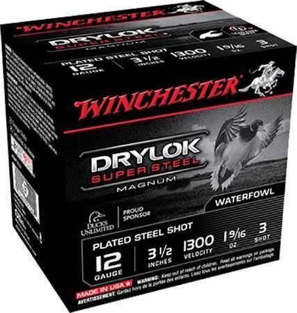 Supreme High Velocity Drylok Super Steel and Super-X Drylok Super Steel Shotshells give you the ultimate in water resistant, high velocity, knock down performance in any foul weather hunting condition. Product Specifications: Gauge:12 Gauge Type:Steel Length:3.5" Ounces:1-5/8 oz Shot Size:3 Muzzle Velocity:1375 fps Rounds Per Box:25 Boxes Per Case:10