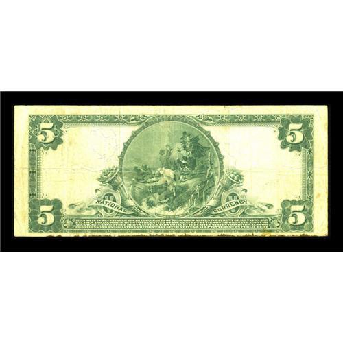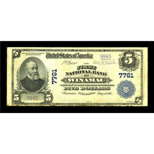 <B>Winamac, IN</B></I> - $5 1902 Plain Back Fr. 598 <B>The First NB</B></I> Ch. # 7761<BR>A little bleed through is seen along the bottom margin on this issue with twelve large size known. Signatures are still visible on brightly inked surfaces. <B>Fine.</B></I><BR><BR><b>Shipping:</b> Coins & Currency (<a target="_blank" href="http://www.heritageauctions.com/common/shipping.php">view shipping information</a>)