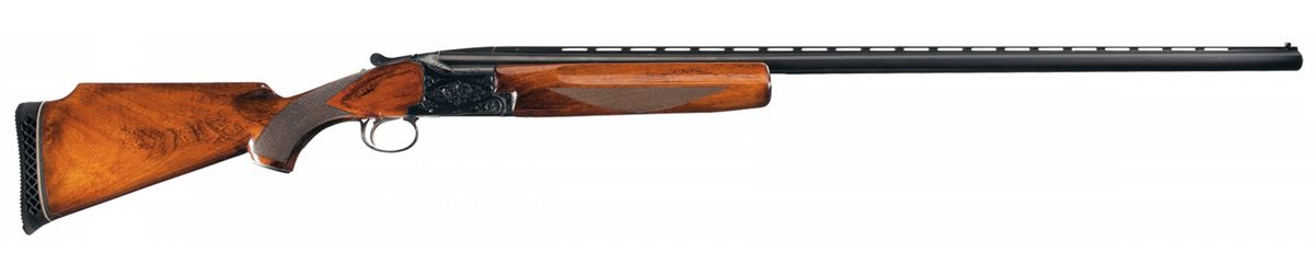 This shotgun has a pink and clear front bead with a white mid bead, choked full, 2 3/4 inch chamber with extractor. The receiver break lever and trigger guard have floral scroll engraving. Mounted on a multi-point checkered walnut forearm and pistol grip stock with raised comb, steel grip cap and Pachmayr recoil pad. Length of pull is 14 inches.