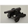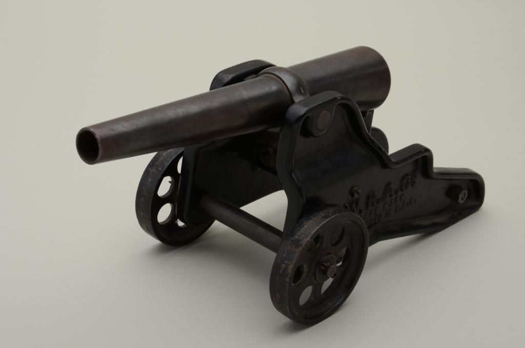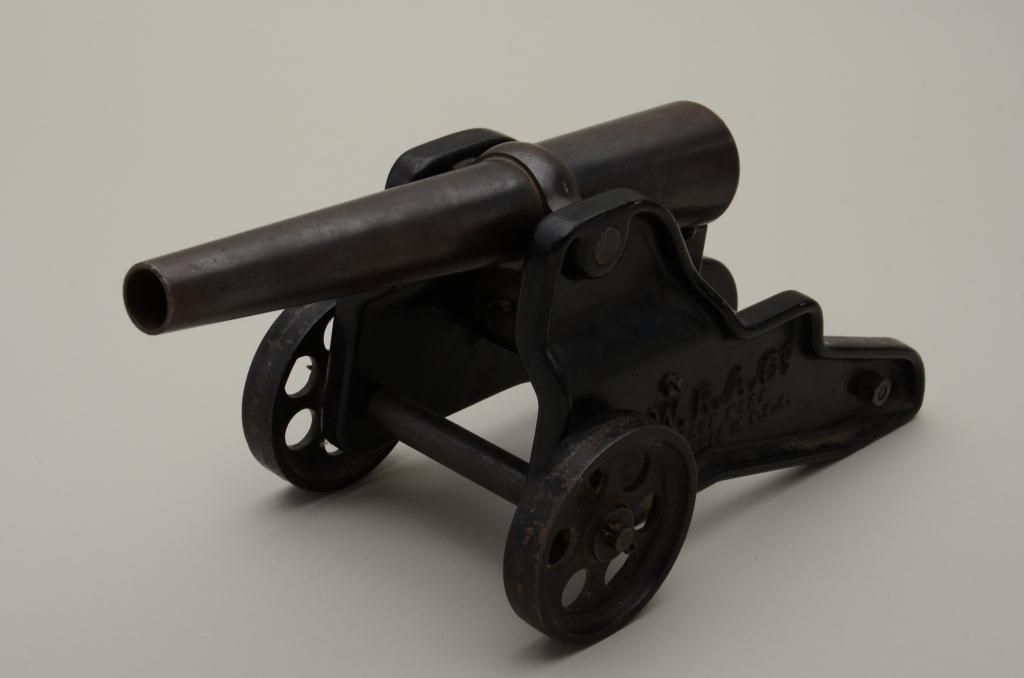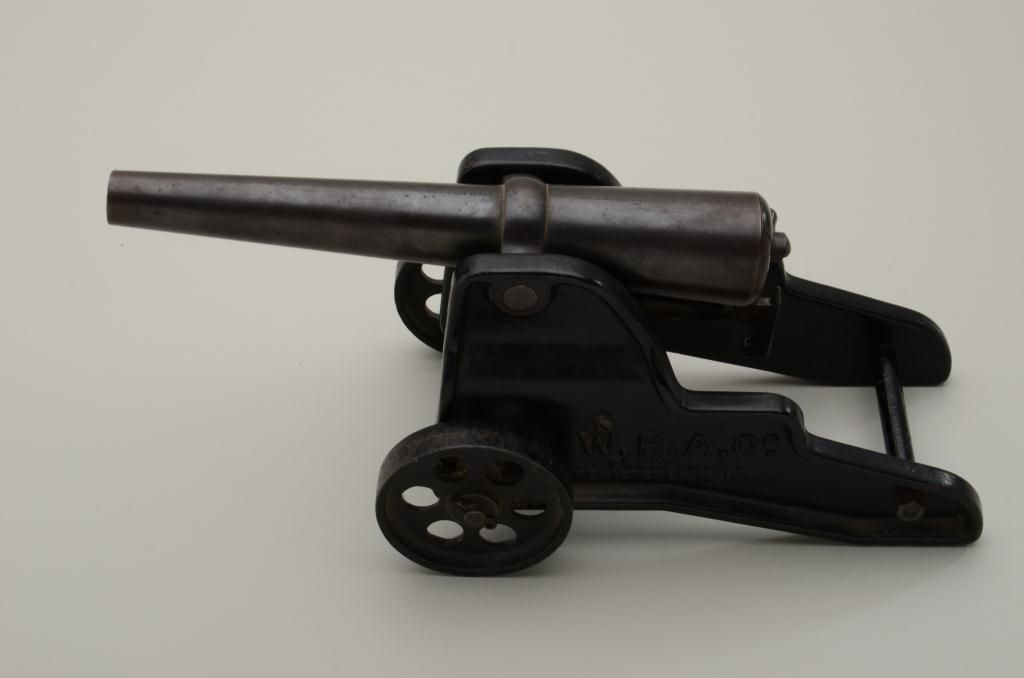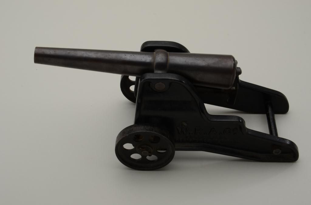 Winchester 10gauge signal cannon with iron wheels in very good original condition. The carriage shows most of its’ painted enamel finish with just some losses on the edges and wheels. The areas where the paint is liftedhas gone to a natural patina with some Rust and erosion. The blued barrel shows most of its original finish with sharp markings and just some minor beginning light pitting. Est.: $400-$800.