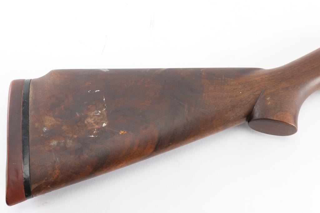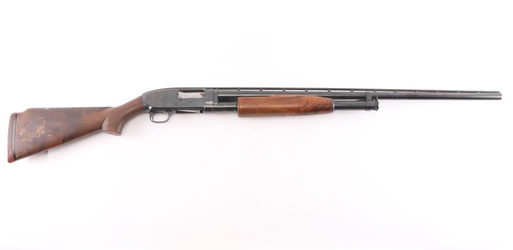 Vintage Winchester Model 12 circa 1929. Shot has been upgraded with newer wood, and by adding a full length vented rib that extends over the receiver. 28" blued barrel with steel bead sight. 2 3/4' chamber, fixed Mod choke. It sports a two piece satin finished stock with a smooth forearm and a high comb shoulder stock with solid factory red rubber recoil pad. The wood stocks are very good/sound with minor scratches. There are flecks of white paint on the left stock, should clean off. Action is smooth. Blue is about 85% with slight edge wear, minor scratches, some very light pin-prick pitting on the receiver. Bore appears excellent/bright. LOP is 14". Matched serial numbers. Markings are crisp/clear. A well taken care of shotgun.