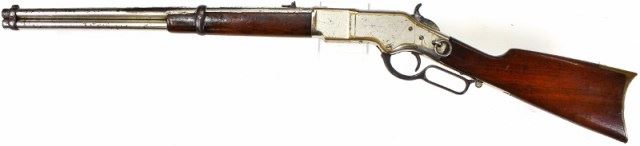 lever action carbine, full nickel finish, standard 20" barrel, walnut stocks with matching serial number crescent butt plate. Desirable carbine, very good original condition, barrel 75-80% nickel, clear Winchester address and early leaf sight, magazine 80-85% remaining nickel, barrel bands gray brown, receiver approx. 85% remains most loss from high edge wear, side plates with good fit, serial number located as 3rd style between trigger and lever lock with small letters, FB following. Lever displays a dark gray, light pin prick pitting, hammer shows visible nickel, saddle intact. Forend shows some loss to upper edge left and right sides ahead of barrel band but generally good, rear stock good, no chips, cracks or repairs, left and right sides have been fitted with sling swivels at some point of time. Fitted with numbers matching brass crescent butt plate 20-30% nickel. Mechanically tight, good action, good bore, rifling shows some erosion. Mfg'd 1871 Antique. Est. 7000-14000
