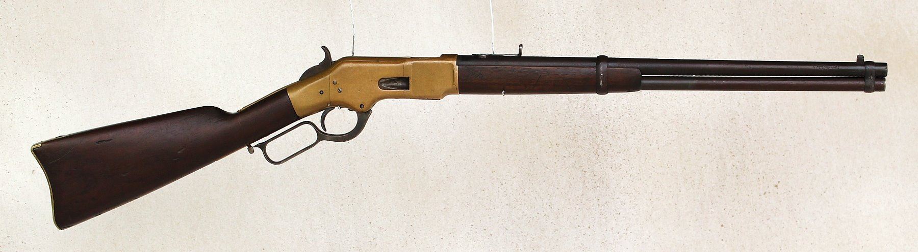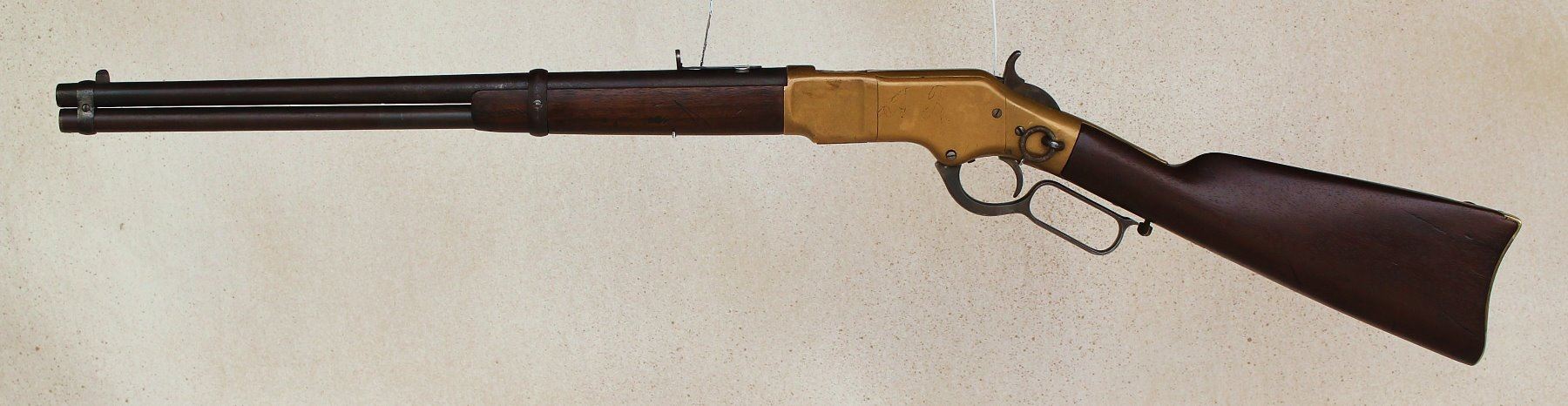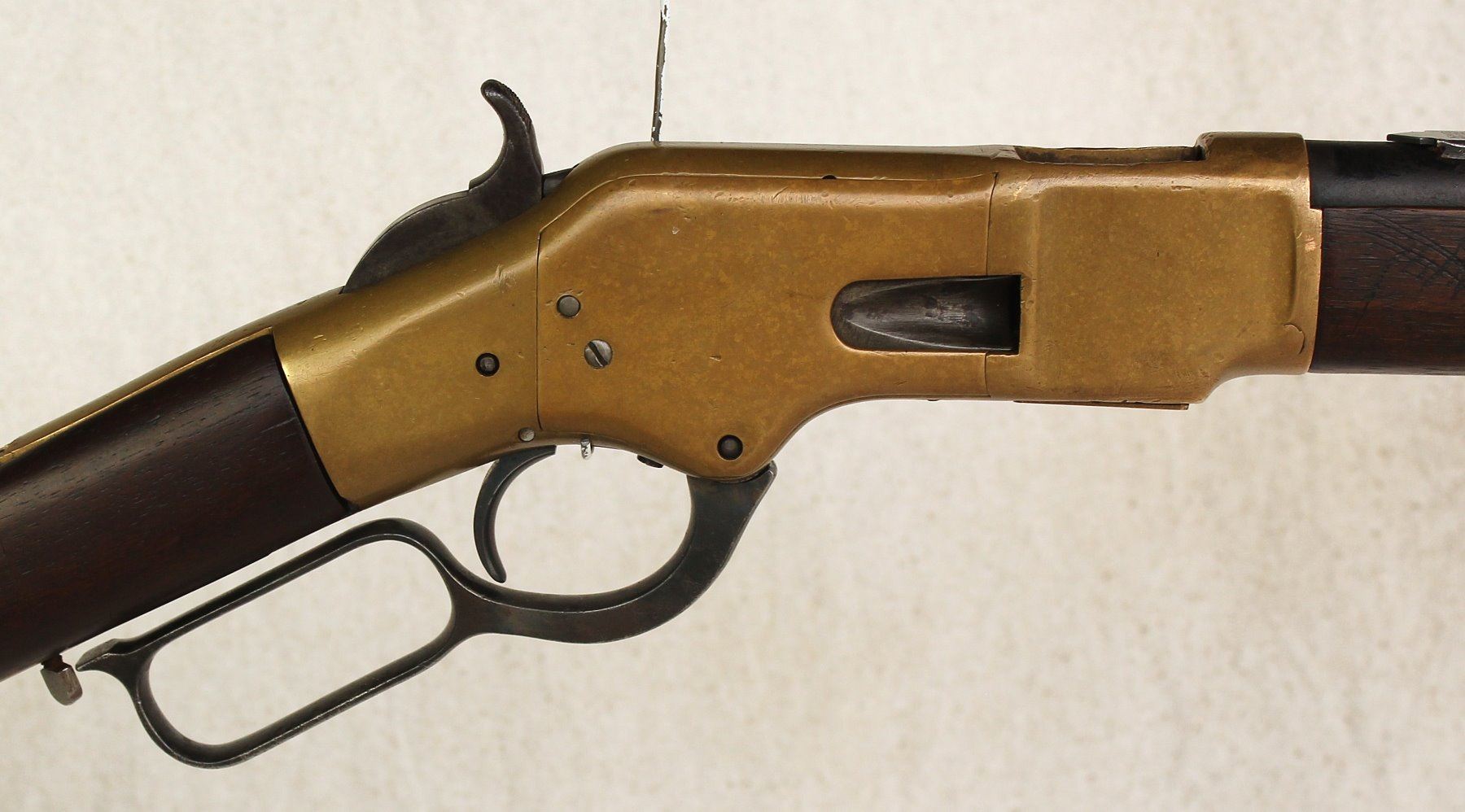 Highly desired western carbine with fabulous brass patina, attractive metal finish and light colored wood. Showing a nice condition overall, with a repaired tang and no visible serial number.
