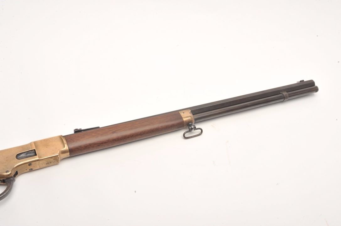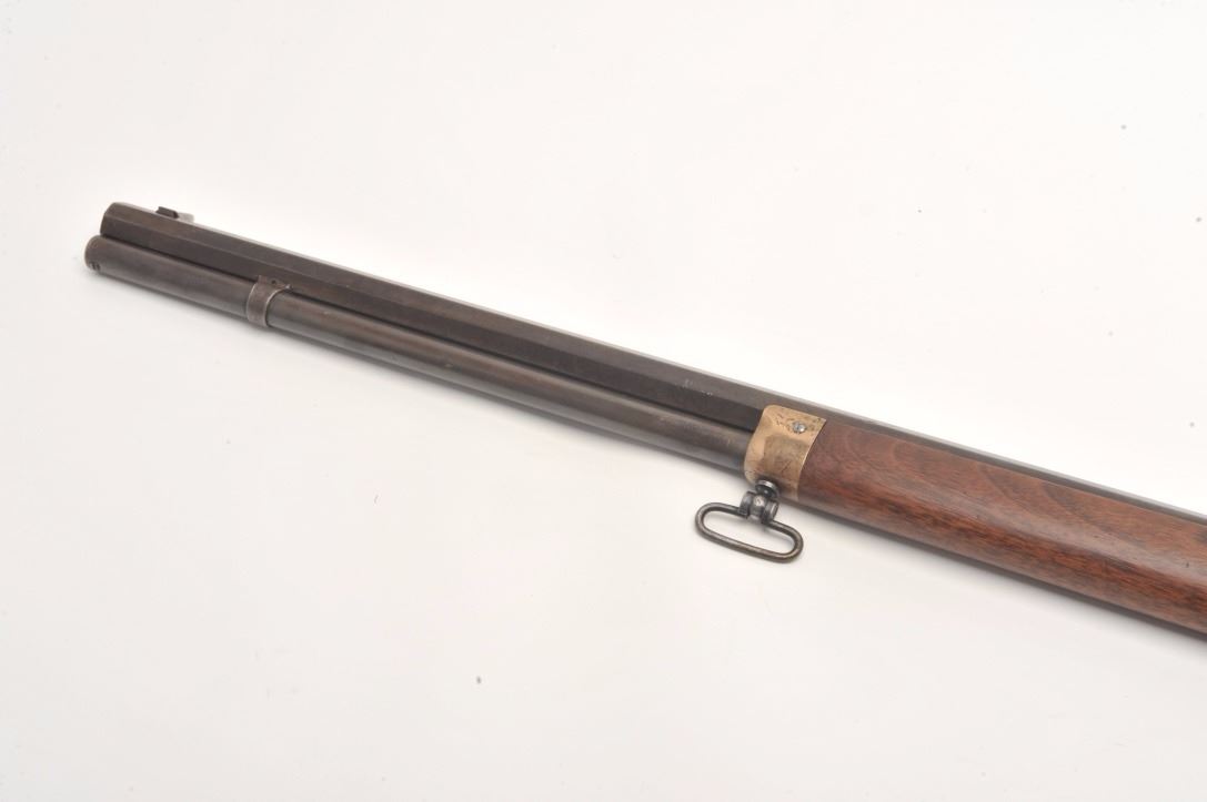 Winchester 1866 rifle in .44 rimfire caliber showing a octagon barrel, S/N 36245. Made in early western frontier era. This rifle shows brown patina on the frame with full address and good edges along with correct stylesights. Good frame with minor nicks and sling swivels. In good to very good condition overall with well restored stocks. The action is good and the bore is fair. These ’66 octagon barrel rifles were the firstWinchester to the frontier preceding the ’73. They have all but dried up at shows. (Antique) Est.: $6,000-$12,000