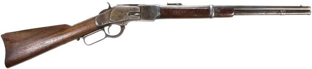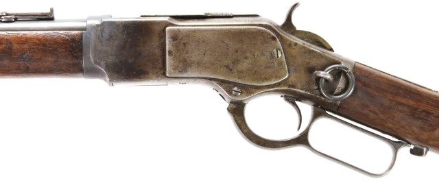 saddle ring carbine with standard 20" barrel and walnut stocks. Good action with fair bore that may clean to good. Rare caliber for a 73'. Est. 1200-1600