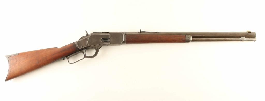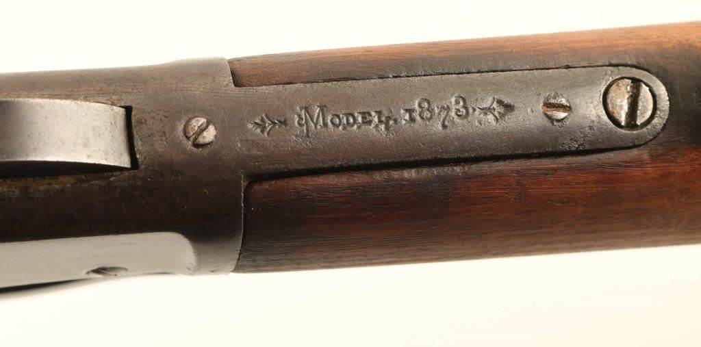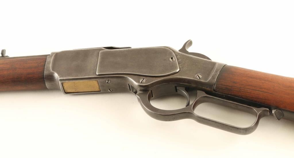 Rifle. Lever-Action. 22" octagonal barrel with front blade, and Marbles notch rear sights. Smooth walnut stock, and forearm with crescent steel buttplate. Sliding brass door for storage in stock. All markings are clear/readable except for the "38-Cal" on the barrel is a little faded. Bore appears very good/bright. Action is smooth/tight. There is a 3 1/2" split at the top of the tube magazine. Wood is good with minor scratches/dings. Also is a narrow crack that runs along the right of the forearm. Barely noticeable. Blued metal finish has turned a dull gray/plum color. Front sight blade may be a replacement. Barrel appears to have been cut down to its present length. Still, consignor states its a "Good Shooter" NRA Condition-Antique Fair. Antique Firearm.
