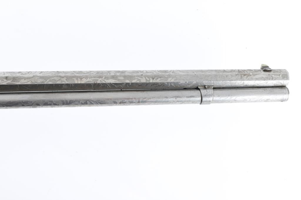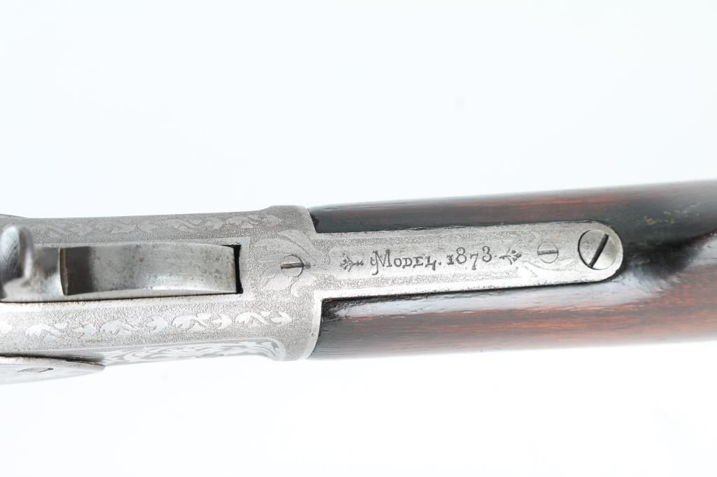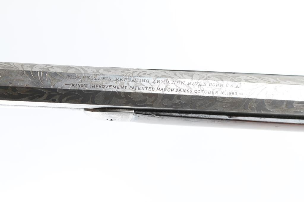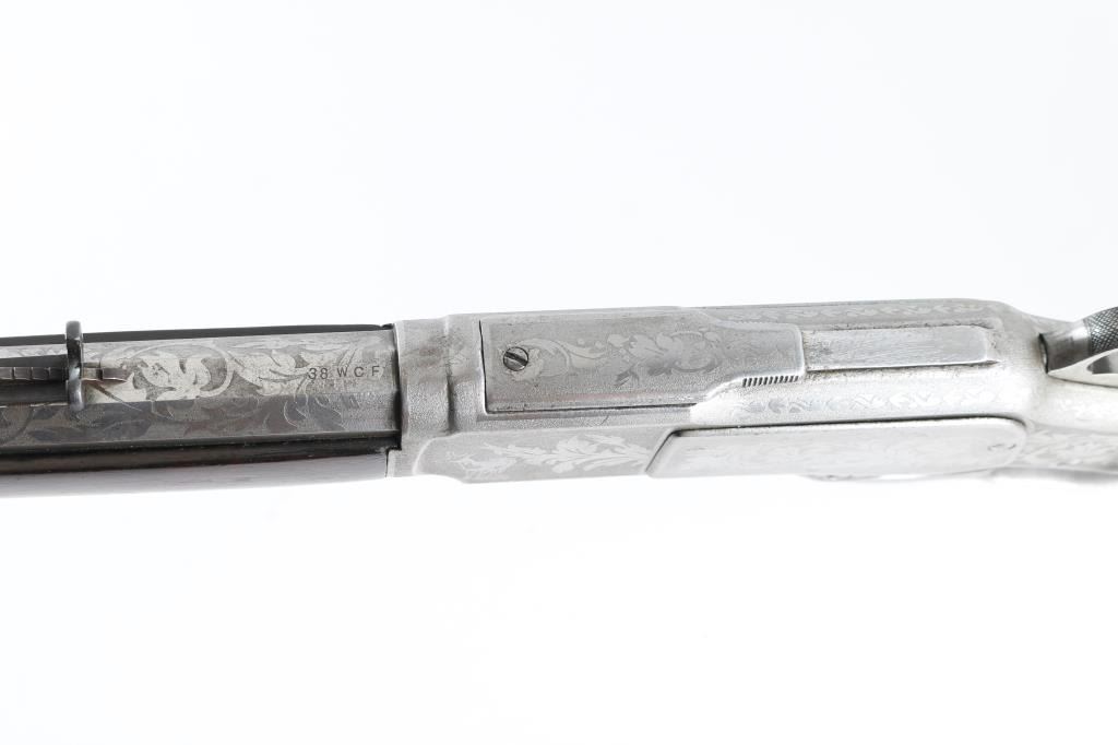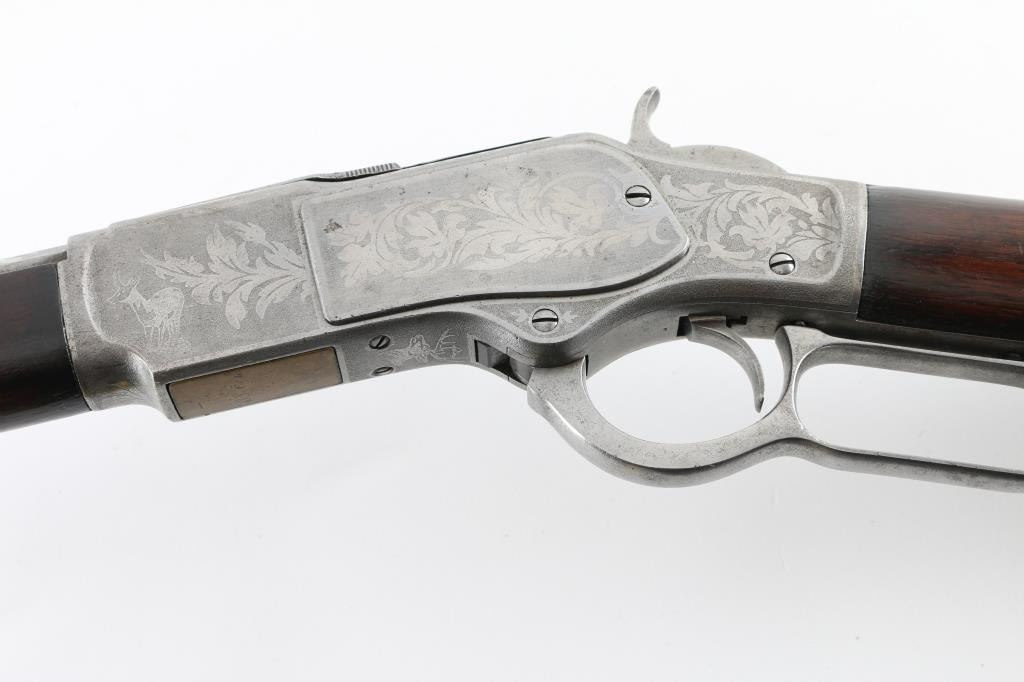 Lever action rifle manufactured circa 1890. Features 24" octagon barrel, full length magazine tube, buckhorn sights, straight grip, lever lock, sliding dust cover, steel crescent buttplate with trap & sliding door. Bore is fair condition, dark with even tiny pits, shallow rifling. Metal surfaces are bare metal, with nearly full coverage floral engraving applied with an etching process, showing a contrast between smooth surfaced features over a stippled appearing background. Forend is good condition, varnished, with dents & dings. Butt is good condition, varnished, fair fit to metal, some shrinkage, possibly sanded. Markings are clear & readable. Action operates smoothly. Condition is NRA Good++ *** Antique Firearm ***