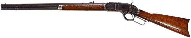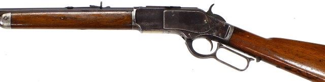 lever action rifle 24" octagon barrel, full mag, blued finish, walnut stocks and crescent iron butt plate. Remains in very good original condition, barrel shows 80-85% blue with thinning area to left side, light scattered pin prick pitting, light pitting at muzzle end. Mag tube shows 90-95% blue, forend cap silver gray drifting brown, fixed blade front and sporting rear sights. Receiver shows 50-60% blue, left side below hammer with some pin prick pitting, visible case on hammer, lever plum brown overall, crescent butt plate gray to plum. Walnut stocks remain very good with original finish, NO chips cracks or repairs. Well cared for 73, excellent action very good bore. Mfg'd 1902 Modern. Est. 3500-5500