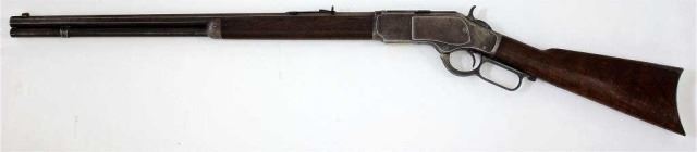 Winchester 1873 .38 cal. SN 46XXXXlever action rifle with 24" octagon barrel, full magazine and standard walnut stocks, condition is very good, all metal surfaces showing a plum brown patina with traces of blue in protected areas, walnut stocks remain unsanded with excellent wood to metal fit, all untouched, action is excellent with fair bore, made in 1893. Antique. Est. 1800-2200