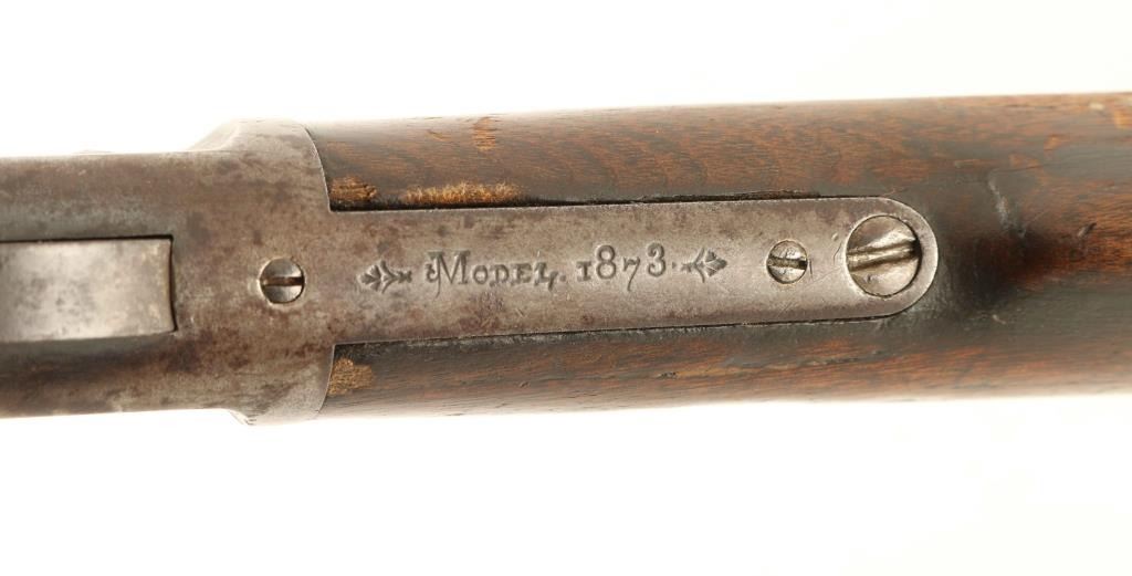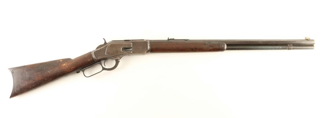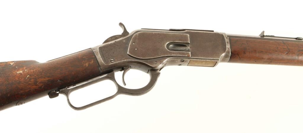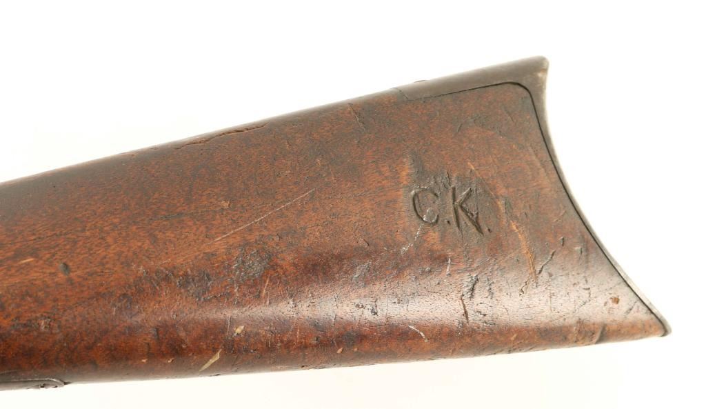 'Third Model' Antique lever action repeating rifle chambered in .44-40 Winchester, manufactured circa 1888. Features a blued finish, 24 3/8" octagon barrel stamped "WINCHESTER'S REPEATING ARMS. NEW HAVEN. CT./-KING'S IMPROVEMENT PATENTED MARCH 29. 1866. OCTOBER 16. 1860-", dovetailed front sight with brass blade, flat-top adjustable rear sporting sight, full-length tube magazine, smooth trigger, knurled hammer spur, sliding dust cover, grip safety, smooth walnut forend with metal cap and straight grip shoulder stock with "C.K." carved into the left side & crescent trapdoor buttplate. Rifle retains less than 10% of it's original finish with bluing retained in protected areas with balance of the metal surfaces turned to an aged brown patina showing some scattered spots of dark rust. The action appear to be in good working order except the firing pin extension does not push the hammer far enough back to lock it into the cocked position, the bore has good luster with light rifling & pin prick pitting, markings are clear, and the wood stock are good with repairs & losses. Condition is NRA Good. ***Antique Firearm***