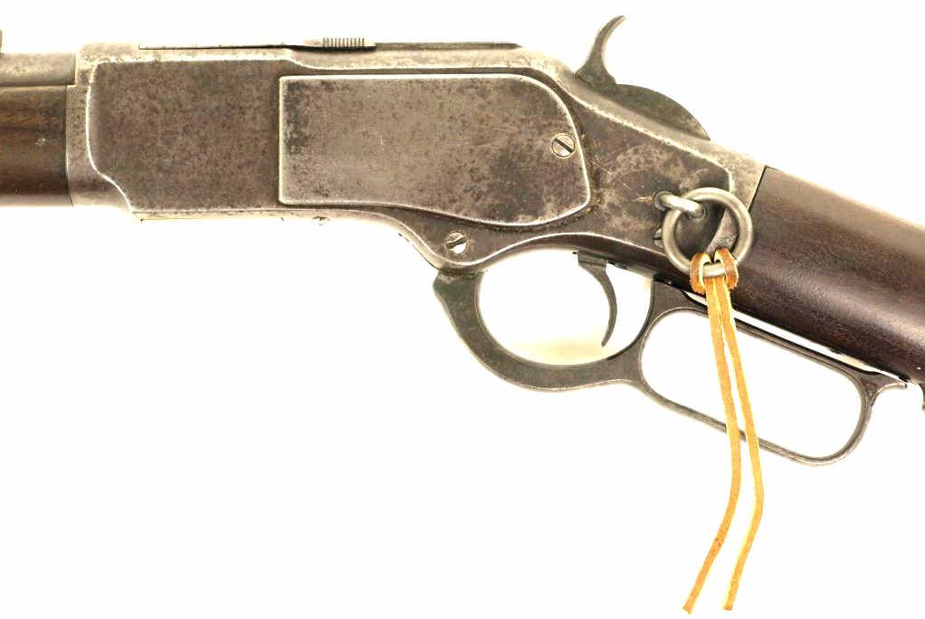 third model carbine with 20" barrel and walnut stocks. Carbine remains in good overall condition the barrel and magazine tube displaying a gray to brown natural patina. Original front and rear sights are intact the receiver shows some finish as barrel and magazine. Original front and rear stocks show very good condition with no cracks or repairs and are fitted with sling swivel eyes. Action is very good the bore dark with good rifling. An honest unmolested carbine made in 1884. NO FFL required.