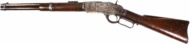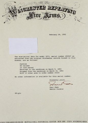 carbine lever action 16" barrel confirmed by factory letter. Trapper complete and original condition, barrel and mag tube silver gray drifting brown, area of visible blue at muzzle end of tube, visible markings. Receiving silver gray patina, original dust cover, saddle ring and staple intact, scattered areas of pin prick pitting, original walnut stocks with moderate scattered dings and dents, original cleaning rod butt plate intact. Very good action, fair bore. Antique, Mfg'd 1893. Est. 4500-6500