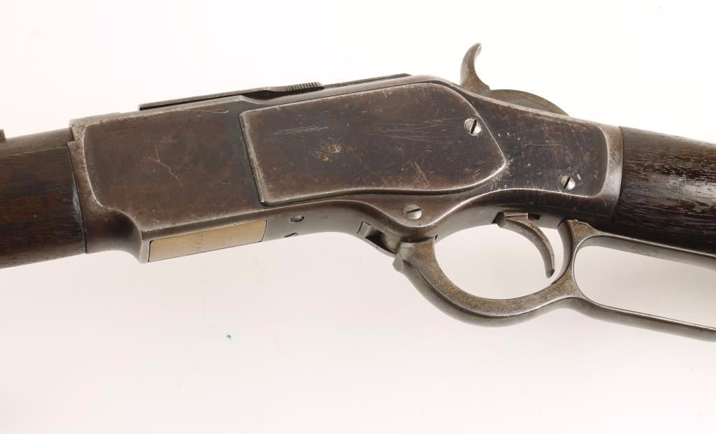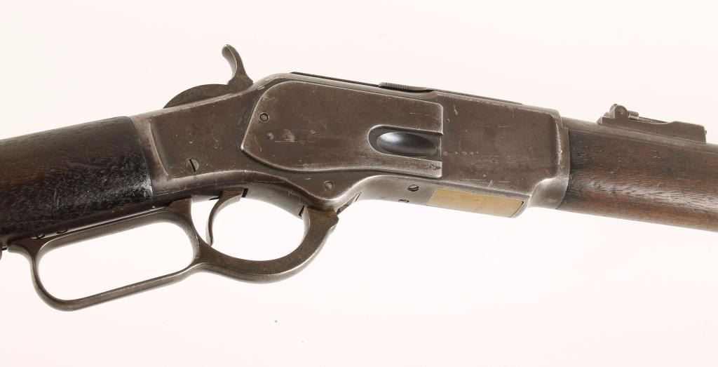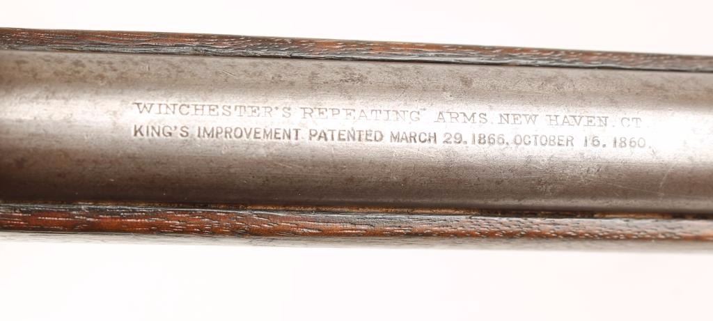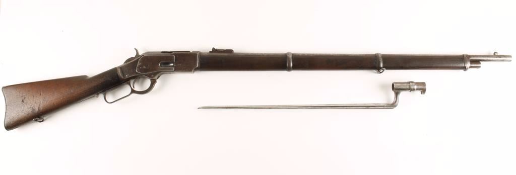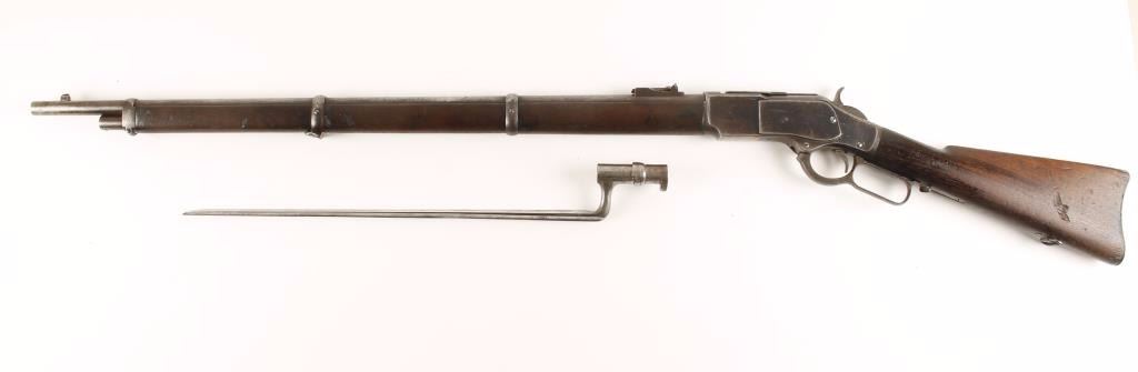 'Third Model Musket' Tube-fed lever action repeating rifle chambered is .44-40, circa 1894. Features a blued finish, 30" barrel with three barrel bands, 3/4 tube magazine, front sight/bayonet lug, folding leaf adjustable elevation rear sight, dust cover, sling swivels, rounded metal buttplate with trapdoor, smooth trigger, checkered hammer spur, nearly full-length walnut forearm and straight grip shoulder stock. Includes bayonet. Barrel shows a brown patina with dark spotting. Receiver retains some bright bluing and an otherwise browning patina. Wood stocks are good with a moderated amount of blemishes. Action is very smooth and bore is excellent. Condition is good to very good as antique. ***Antique Firearm***