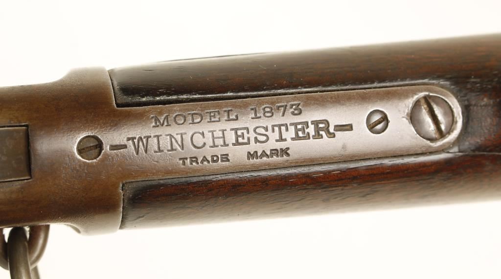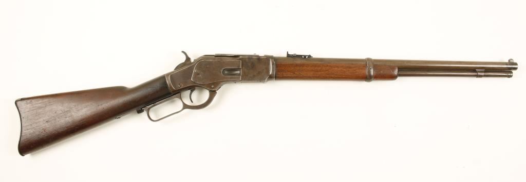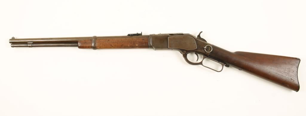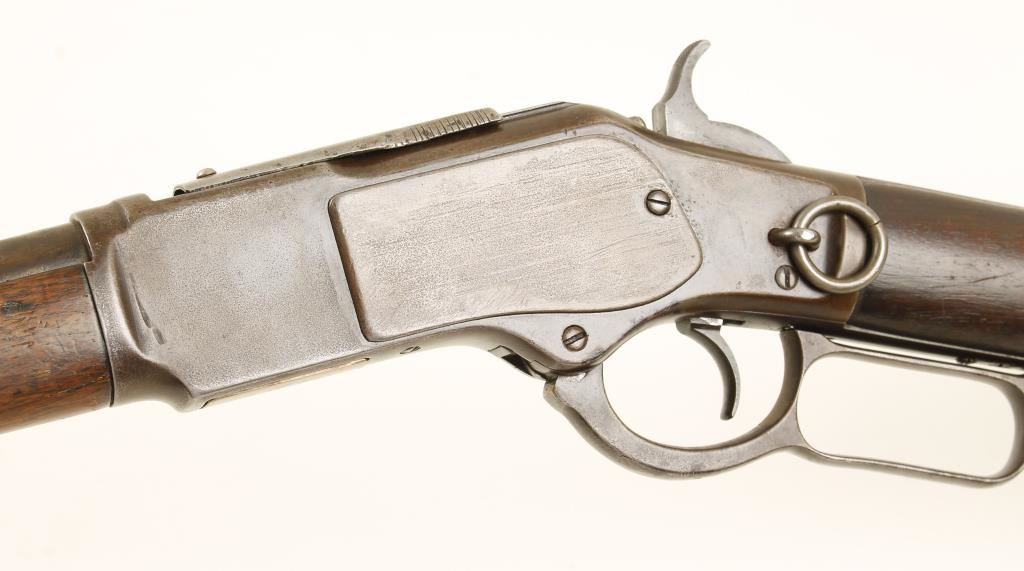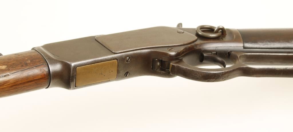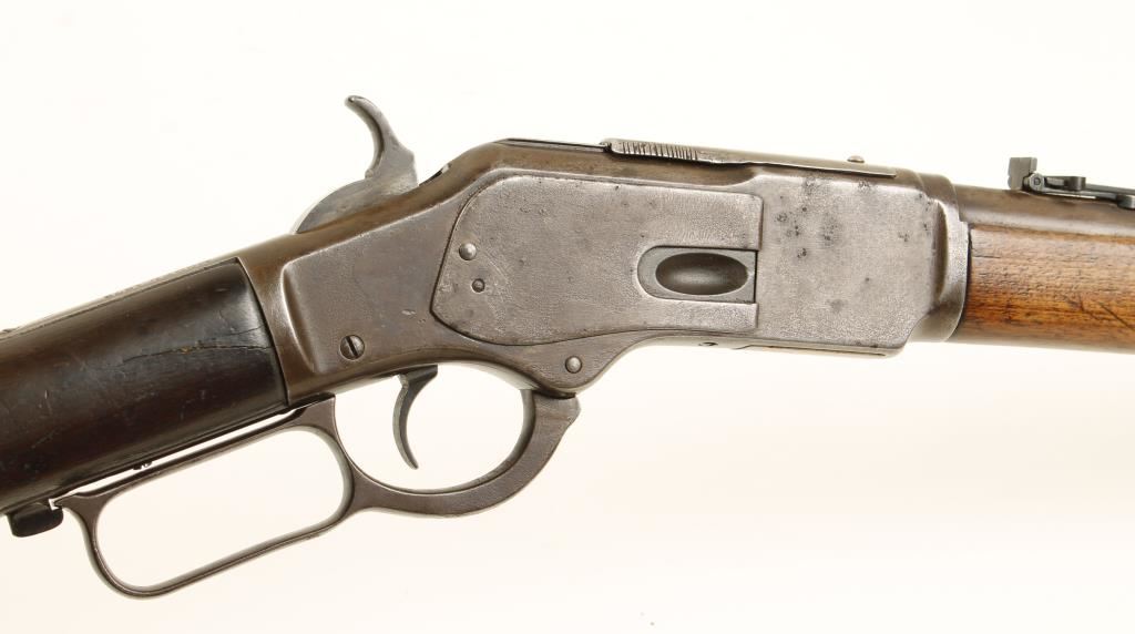 Blued lever-action saddle ring carbine with a 19-3/16" rifle barrel. Metal has turned to patina with dings, dents and some pitting. Dust cover looks like it may be hand made. Rear sight is a replacement. Buttstock has cracks at the receiver. It also has scratches and dings. Forend is quite worn with scratches and scrapes. Bore is dark and pitted with little rifling. Action is stiff but it works. Condition is poor. *Antique Firearm*