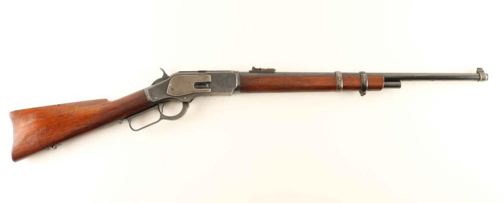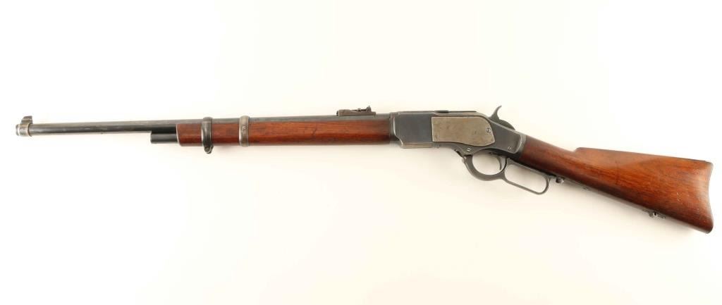 Altered late production Third Model lever action repeating rifle, manufactured circa 1920's. Features a blued refinish, shortened 22 5/16" round barrel stamped "WINCHESTER'S REPEATING ARMS. NEW HAVEN. CT./-KING'S IMPROVEMENT PATENTED MARCH 29. 1866. OCTOBER 16. 1860-", sight band on the barrel with pinned blade sight, flip-up ladder style rear sight graduated to 800 yards, 2/3 length tube magazine, smooth trigger, knurled hammer spur, sliding dust cover, grip safety, smooth walnut forend with two barrel bands and straight grip shoulder stock with trapdoor carbine buttplate. The rifle retains the majority of it's bright bluing on the receiver, barrel & magazine tube while the sideplates are in-the-white. Action is smooth, the bore is very good, markings are good and the wood stocks are good with blemishes & 6.5" crack in the underside of the forend. Condition is NRA Good. ***C&R Firearm***