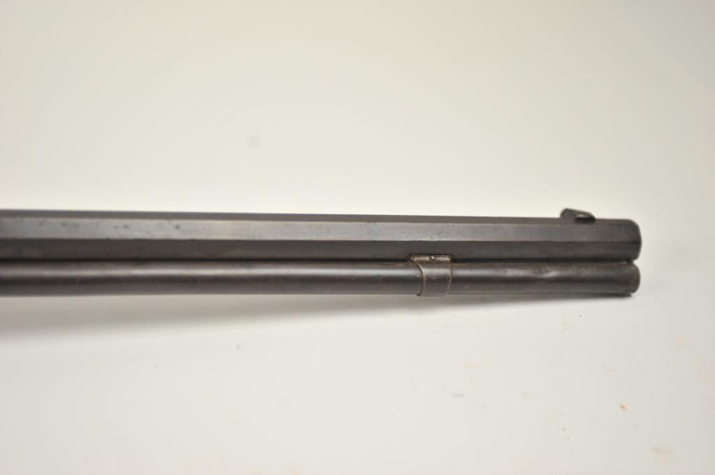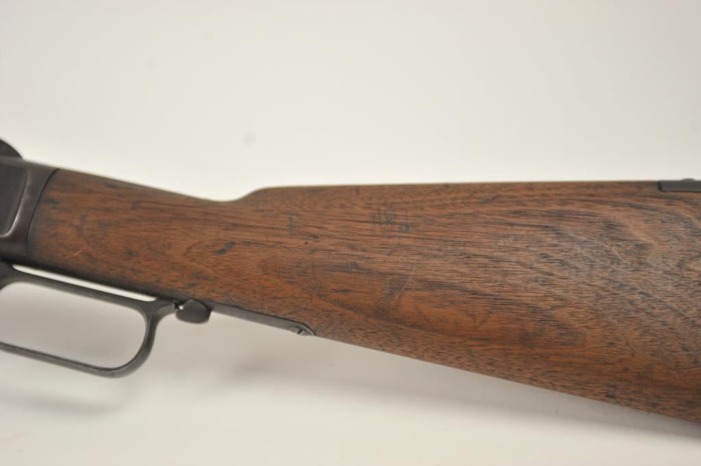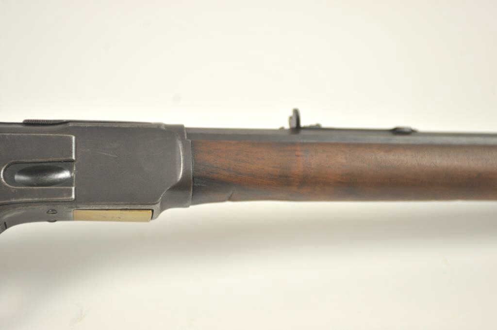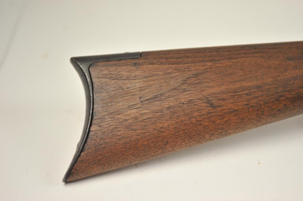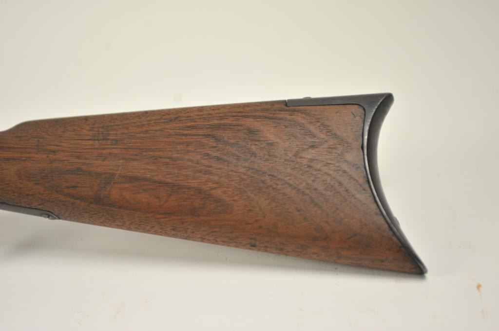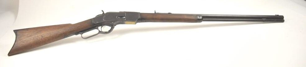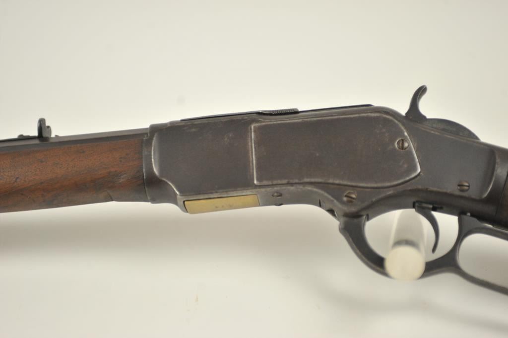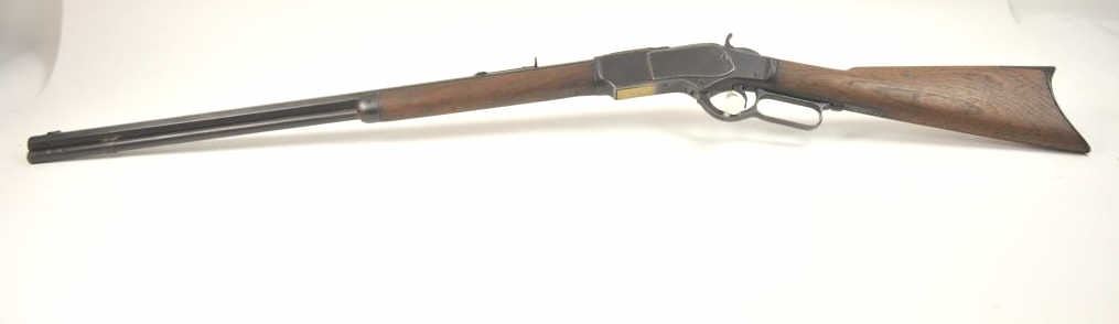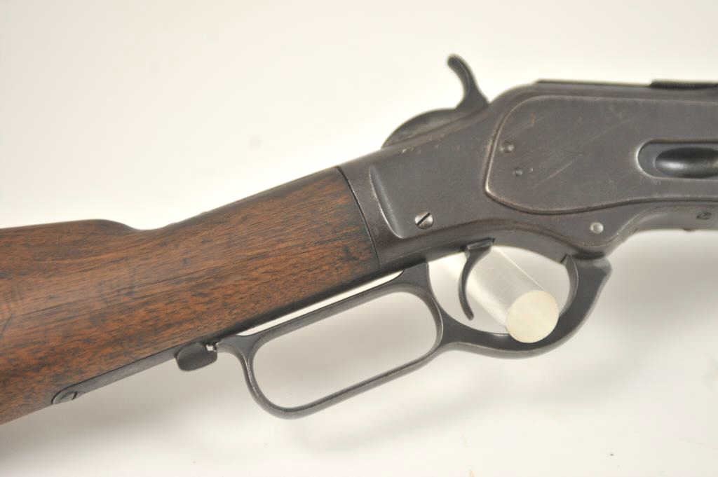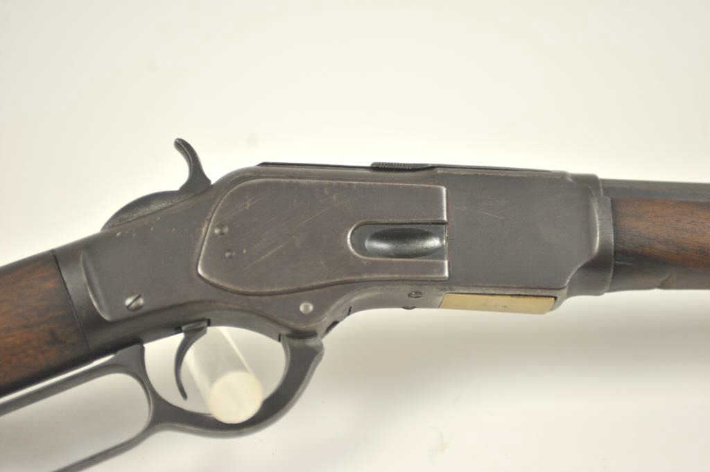 Winchester 1873 Third Model lever action rifle, .32-20 WCF caliber, Serial #179574A. The rifle is in good overall condition with a desirable 26” octagon barrel and full-length magazine. The front sight is a wellaccomplished piece of period gunsmithing utilizing an old coin. The rifle has gone to an overall dark grey patina no markings on the cartridge elevator and the dust cover is retained. The hammer shows silvered casehardening and there is toning blue on the loading gate. The smooth wood stocks are in good condition with mars and compressions. The butt stock ends with a smooth steel crescent butt plate. The bore is fair andthe action works well on this Model 1873 circa 1886. Est.: $700-$1,400. (Antique).