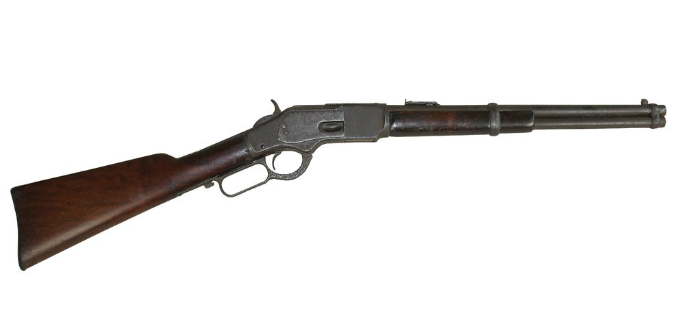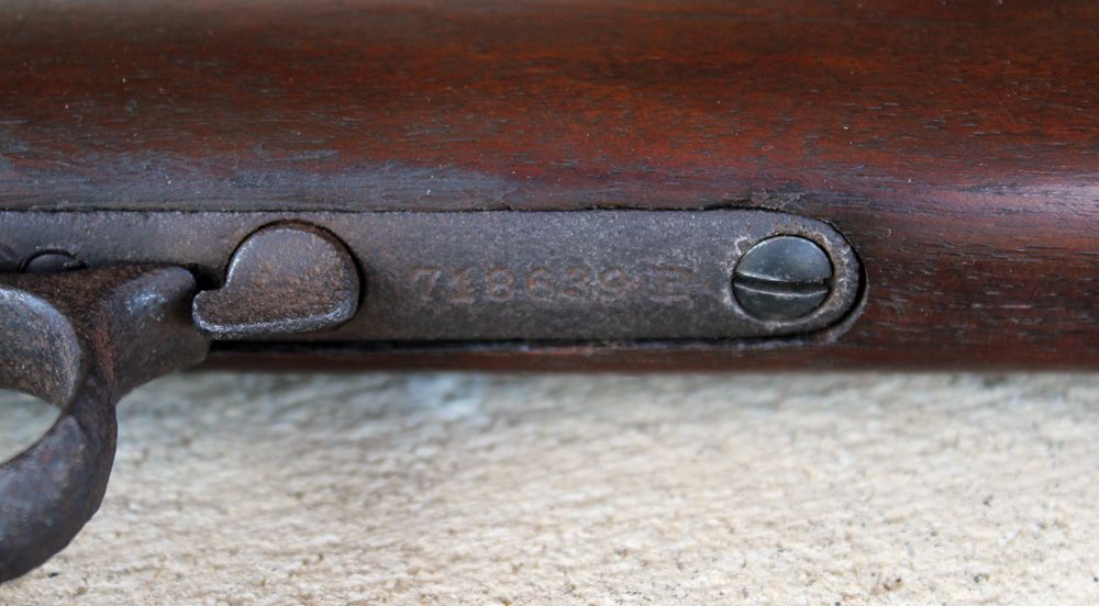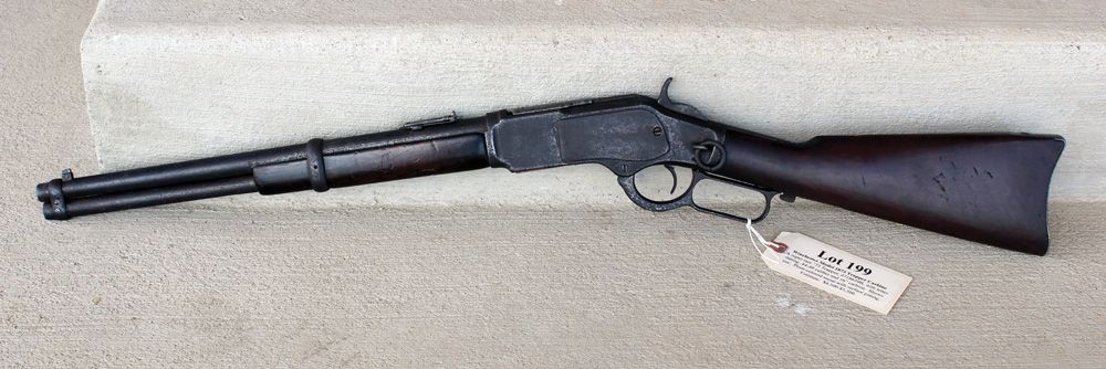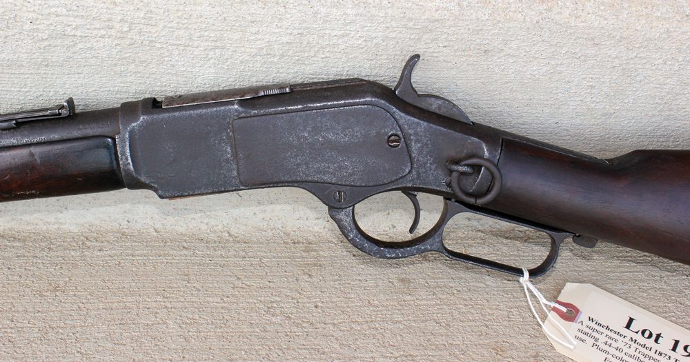 A super rare ‘73 Trapper, serial #718639B, with Winchester letter stating 44-40 caliber and 16” carbine. Shows use. Plum-colored metal with very fine surface pitting.