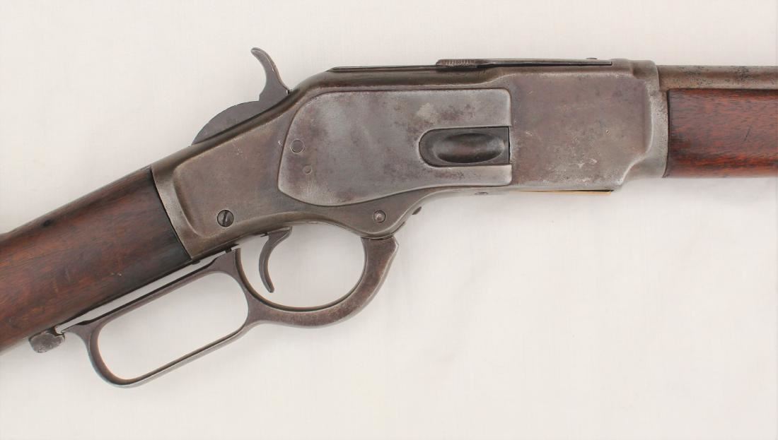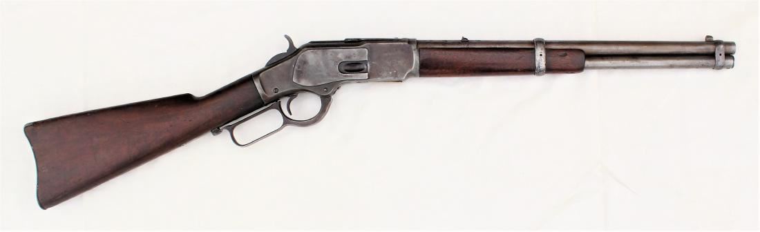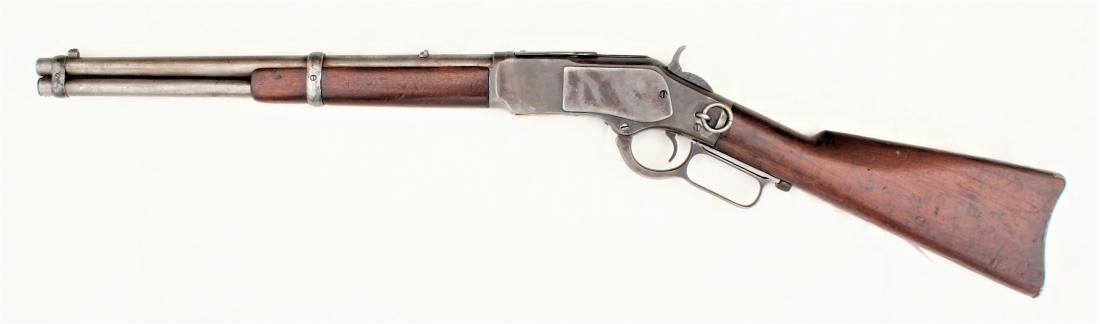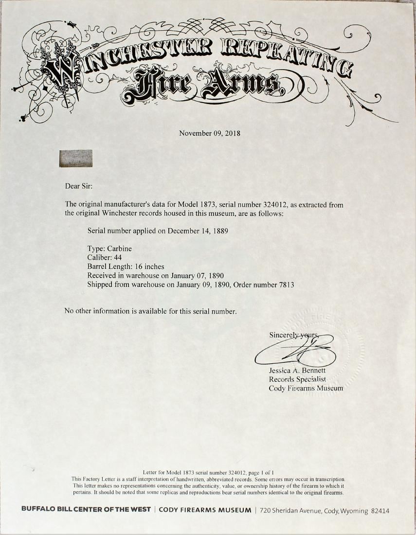 Exceedingly rare 1873, with 16" barrel, chambered in 44-40, accompanied by Winchester Museum letter of documentation stating its features and that is was manufatured January 7, 1890. In nice overall condition with medium colored, well fitting wood, even gray patina ed metal and very ledgible markings.