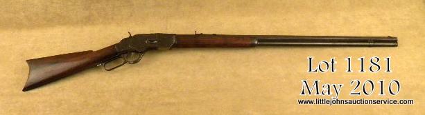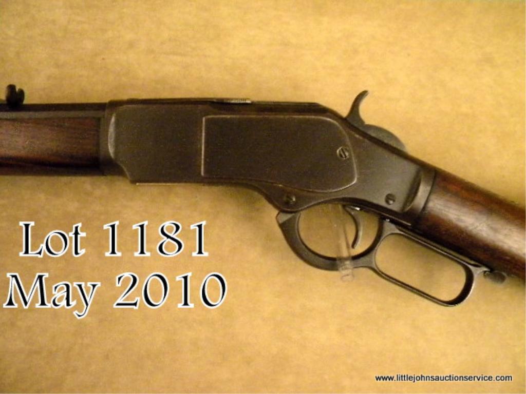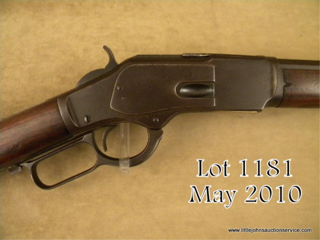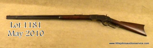 Winchester 1873 lever action rifle, special ordered factory 30" octagon barrel, .38-40 caliber, full magazine, crescent butt, serial #553952B. The rifle shows strong traces of original blue mixed in with a browning patina.Good edges, good markings, caliber marking on lifter completely visible. Good wood with a few small chips in the forend. Some scratches, normal carry and use. The action is good, the bore is fair to good with one ring of erosion. Extra long73's are desirable. Est: $3,000 - $5,000