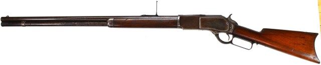 lever action rifle 28" round barrel, full mag with standard walnut stocks and crescent butt plate. Overall very good condition, barrel showing natural brown patina, fixed blade front and adjustable leaf rear sights, mag tube brown with scattered erosion, visible blue at barrel end. Receiver shows visible blue in protected areas. remainder gray brown patina. Walnut stock good, scattered dings and marks, good wood to metal fit. Action good, fair bore. Mfg'd 1882 Antique. Est. 2800-3800