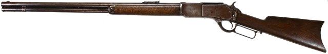 rifle with standard 28" round barrel, full mag, and standard walnut stocks. Early 2nd model with thumbprint dust cover in good original untouched condition, barrel and mag tube show blue in protected areas, remainder gray drifting brown, good visible markings, silver blade front and adjustable leaf rear sights. Receiver shows gray brown patina with traces of blue, original dust cover intact. Walnut stocks rate good, unsanded with saddle wear on bottom of forend, some scattered dings and dents. Good honest 76 with very good action mechanically tight, bore fair with good rifling. Mfg'd 1881, Antique. Est. 3800-4800